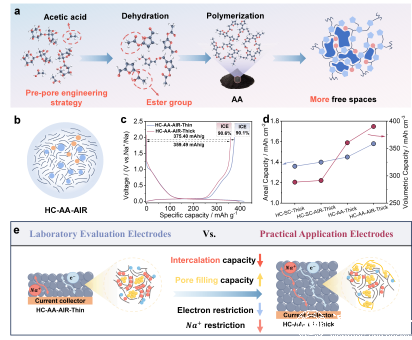 近日,我校化材学院吴星樵/侴术雷联合浙江大学范修林提出了一种硬碳负极的多尺度孔调控策略,有效解决了兼顾高比容量与高体积容量这一长期存在的难题。实验数据与理论计算表明,在水热过程中,乙酸改变了水热炭的疏水性,促进了分散性球形颗粒的形成,并提升了材料的压实密度。预孔工程策略可增加水热炭的自由体积与开放孔结构:其中,酯化反应形成的自由体积有利于最终硬碳中封闭孔结构的构建,而氧化刻蚀产生的开放孔则便于硬碳后续形成微孔结构。得益于对硬碳材料微观与介观尺度的双重调控,该材料展现出优异的电化学性能,其可逆容量达 375.40 mAh/g,首次库伦效率达 90.10%。当厚电极受到更高压实处理时,其球形形貌使其仍能保持较高的克容量(359.49 mAh/g),同时体积比容量得到提升(390.30 mAh/cm³)。与普鲁士蓝正极组装成扣式全电池时,电池能量密度高达 318.44 Wh/kg。值得注意的是,在宏观层面阐明了在低电位下,实验室规模与实际应用级电极中钠嵌入及孔填充过程背后的机制,为开发高能量密度钠离子电池提供了宝贵指导。该研究成果以" High-Compaction Spherical Carbon with Tunable Rich Pore Structures for Efficient Sodium Storage"为题,发表在国际顶级期刊《Advanced Materials》上。我校为第一通讯单位,第一作者是我校化材学院2025届硕士陈青杭。我校化材学院吴星樵博士、侴术雷教授、及浙江大学范修林教授为论文共同通讯作者。相关工作受到国家自然科学基金,浙江省自然科学基金等基金的资助。