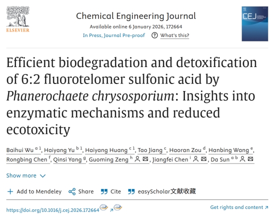 研究聚焦真菌降解6:2 FTSA的机理与安全性验证。6:2 FTSA作为PFAS替代品,因环境持久性和生物毒性(如肝肾损伤、免疫抑制)被视为新型污染物。现有光/电化学氧化法虽有效,但高能耗且易二次污染。本研究利用白腐真菌黄孢原毛平革菌(Phanerochaete chrysosporium)揭示降解机制:7天内去除率99.97%,经MnP和CYP450驱动氧化,实现脱磺化、羟基化和脱氟化,生成短链全氟羧酸;斑马鱼实验证实降解产物降低氧化应激、炎症及行为异常,确保生态安全;解析MnP脱氟与CYP450脱磺化协同,真菌氧化还原平衡及脂质/能量代谢重编程。该技术提供工程参数化见解,作为绿色策略助力6:2 FTSA联合去除(图1),为水体/土壤PFAS替代品治理开辟微生物修复路径,可与物理化学技术结合。