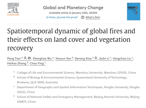 近日,温州大学生命与环境科学学院田鹏博士在地球科学领域的权威期刊《Global and Planetary Change》(中科院一区TOP)上在线发表了题为“Spatiotemporal dynamic of global fires and their effects on land cover and vegetation recovery”的最新研究成果。研究构建了2001-2024年的全球多属性火灾数据集,并对火灾事件的时空分布、复合干扰格局,及其对土地覆被和植被恢复情况进行了深入分析。