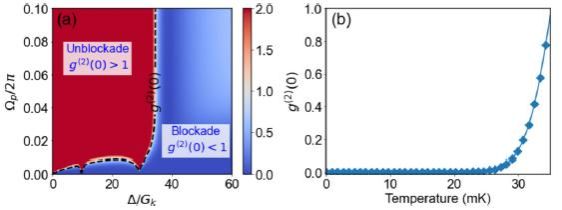 此外,团队还在该系统中理论预测了完美磁子阻断现象。在适当参数条件下,系统可通过量子路径干涉抑制双磁子激发,实现g(2)(0)≈0的强反聚束效应。研究进一步表明,该阻断效应在低于约30mK的温度下具有良好的噪声容忍性,为在真实实验环境中实现单磁子源提供了可能。