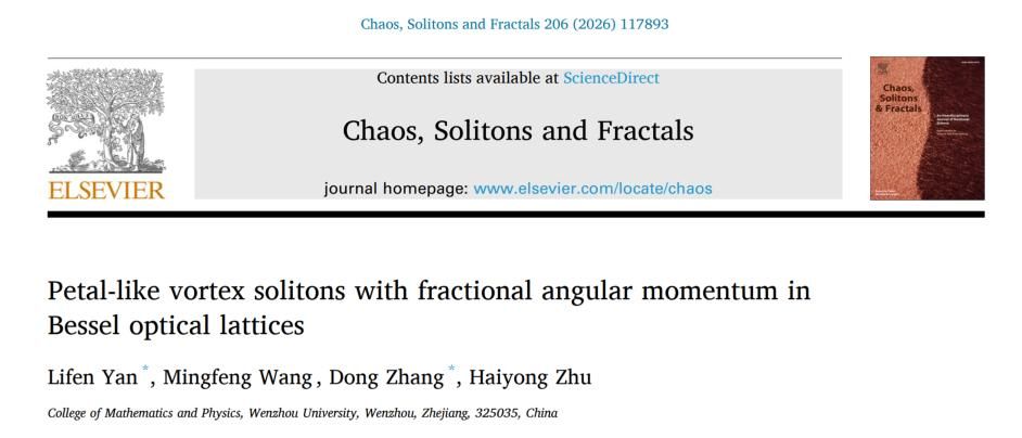 近日,温州大学数理学院颜利芬/张栋老师团队首次预测了在贝塞尔光晶格中稳定存在的“花瓣状”分数阶涡旋孤子,为光场调控与应用带来了新方法。该成果以《Petal-like vortex solitons with fractional angular momentum in Bessel optical lattices》为题发表在中科院一区期刊《Chaos, Solitons & Fractals》(混沌、孤立子与分形)上。颜利芬老师是第一作者,颜利芬老师和张栋老师为共同通讯作者。