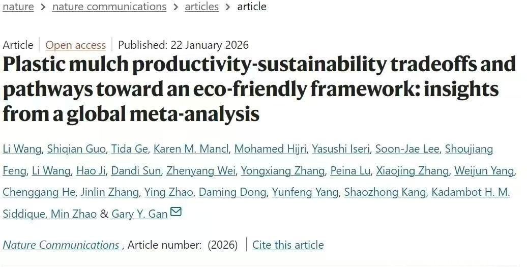近日,温州大学生命与环境科学学院甘延太院士团队联合多个国家的科研机构在国际权威期刊《Nature Communications》在线发表了题为“Plastic mulch productivity-sustainability tradeoffs and pathways toward an eco-friendly framework: insights from a global meta-analysis”的研究论文。该研究基于全球尺度的系统性证据,深入揭示了塑料农膜在提升农业生产力与引发环境风险之间的权衡关系,明确提出了破解“生产力—可持续性悖论”的关键优先事项与可行路径,为全球塑料污染治理和农业绿色转型提供了重要科学支撑。