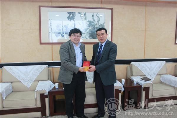 薛伟副校长向客人赠送温州大学纪念品