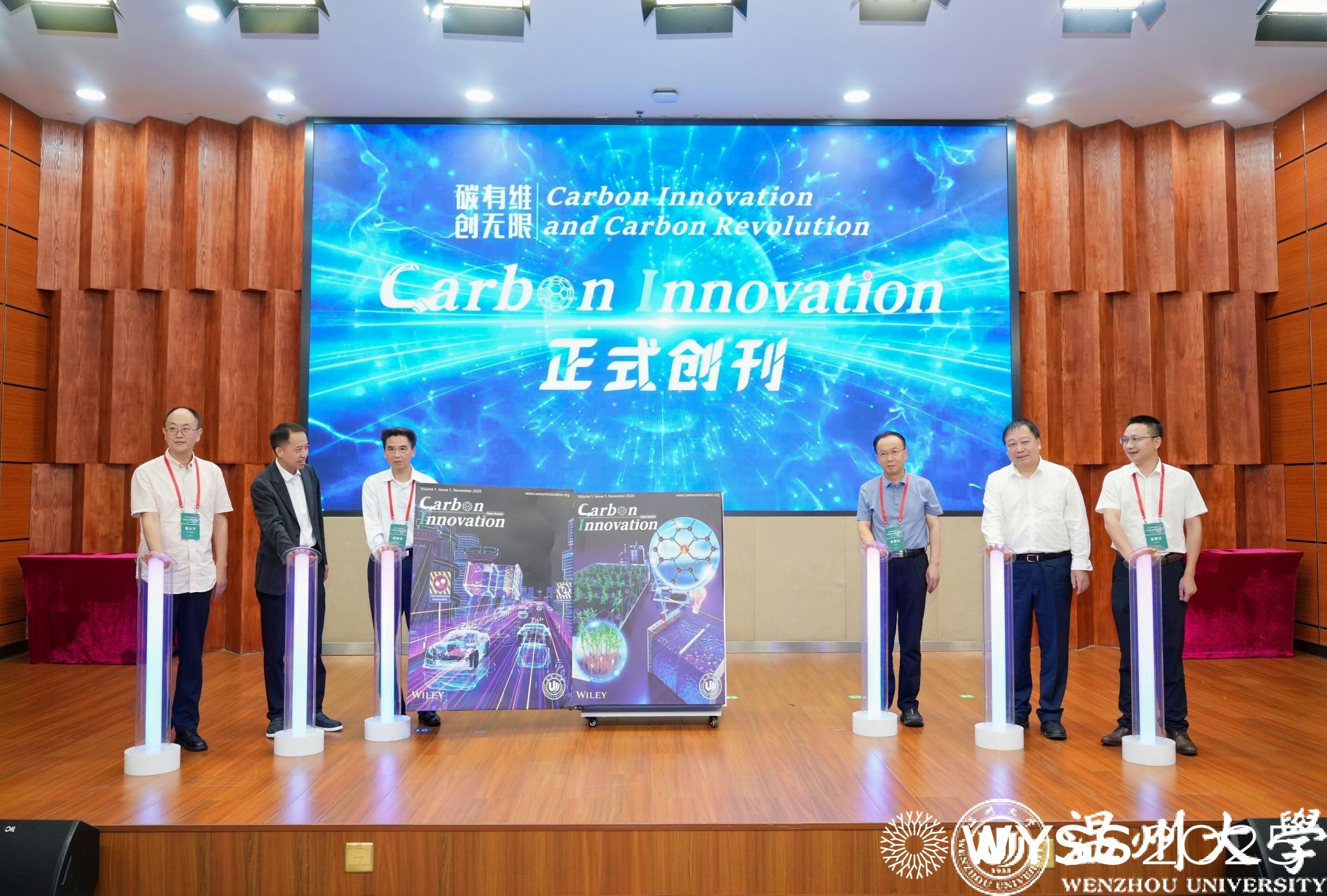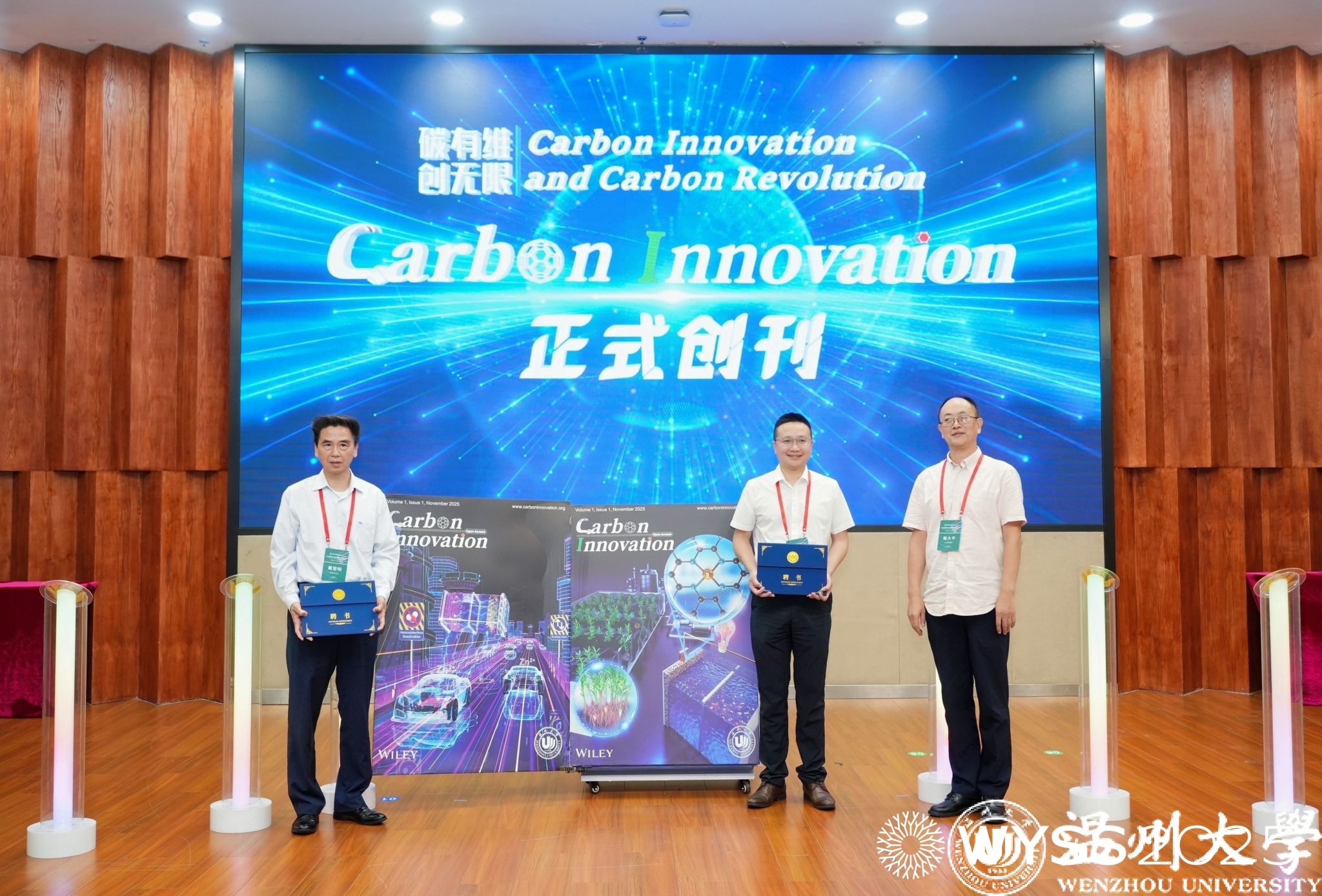 《Carbon Innovation》新刊启动仪式同步举行,戴黎明院士、李景虹院士、陈忠伟院士、赵敏校长、张大平总监、金辉乐副院长共同见证这一时刻,张大平总监还为戴黎明院士、金辉乐副院长颁发《Carbon Innovation》主编证书,标志着温州大学在碳能源领域国际学术传播平台建设再添新翼。