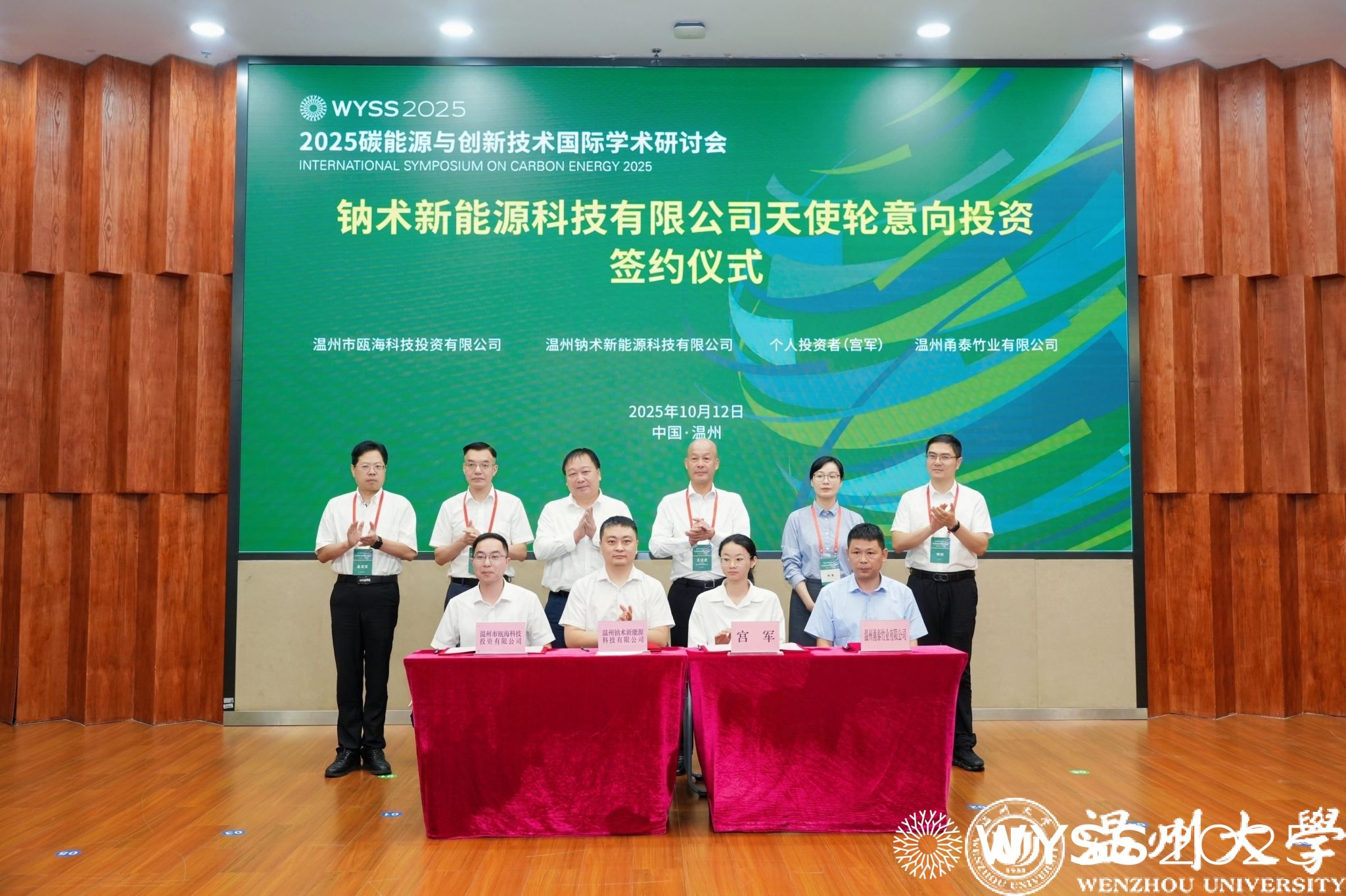 作为产学研融合的重要成果,钠术新能源科技有限公司天使轮意向投资签约仪式举行。温州大学碳中和技术创新研究院院长、钠术新能源创始人侴术雷,个人投资者宫军、温州市瓯海科技投资有限公司董事长兼总经理黄浩然等投资方代表及产业合作方温州甬泰竹业有限公司陈正汉上台签约;赵敏校长、王达武副主席、朱启仁副部长、瓯海区常务副区长林蔓、温州市科技局副局长金龙军、温州市经信局总工程师林剑共同见证,为温州碳能源技术产业化注入新活力。