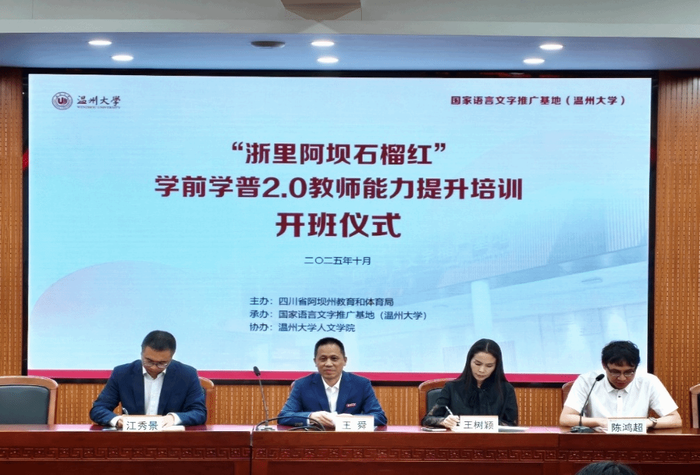 10月21日下午,开班仪式在温州大学人文学院203学术报告厅举行。温州大学副校长、国家语言文字推广基地(温州大学)主任王舜,四川省阿坝州教育和体育局党委委员、州招办主任王树颖,温州大学人文学院相关负责人等共同出席。