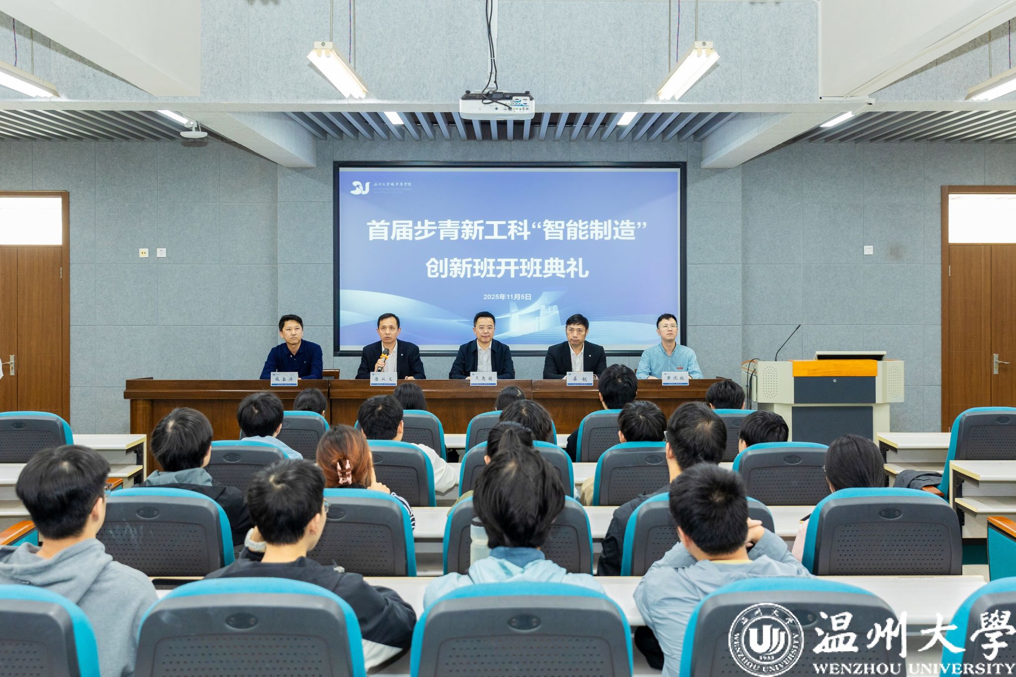 2025 年 11 月 5 日下午,温州大学首届步青新工科“智能制造”创新班开班典礼在南校区 9 号楼 C301 报告厅顺利举行。温州大学副校长王尧骏出席典礼并致辞,教务处、苏步青学院、机电工程学院相关负责人及创新班全体师生参加仪式。