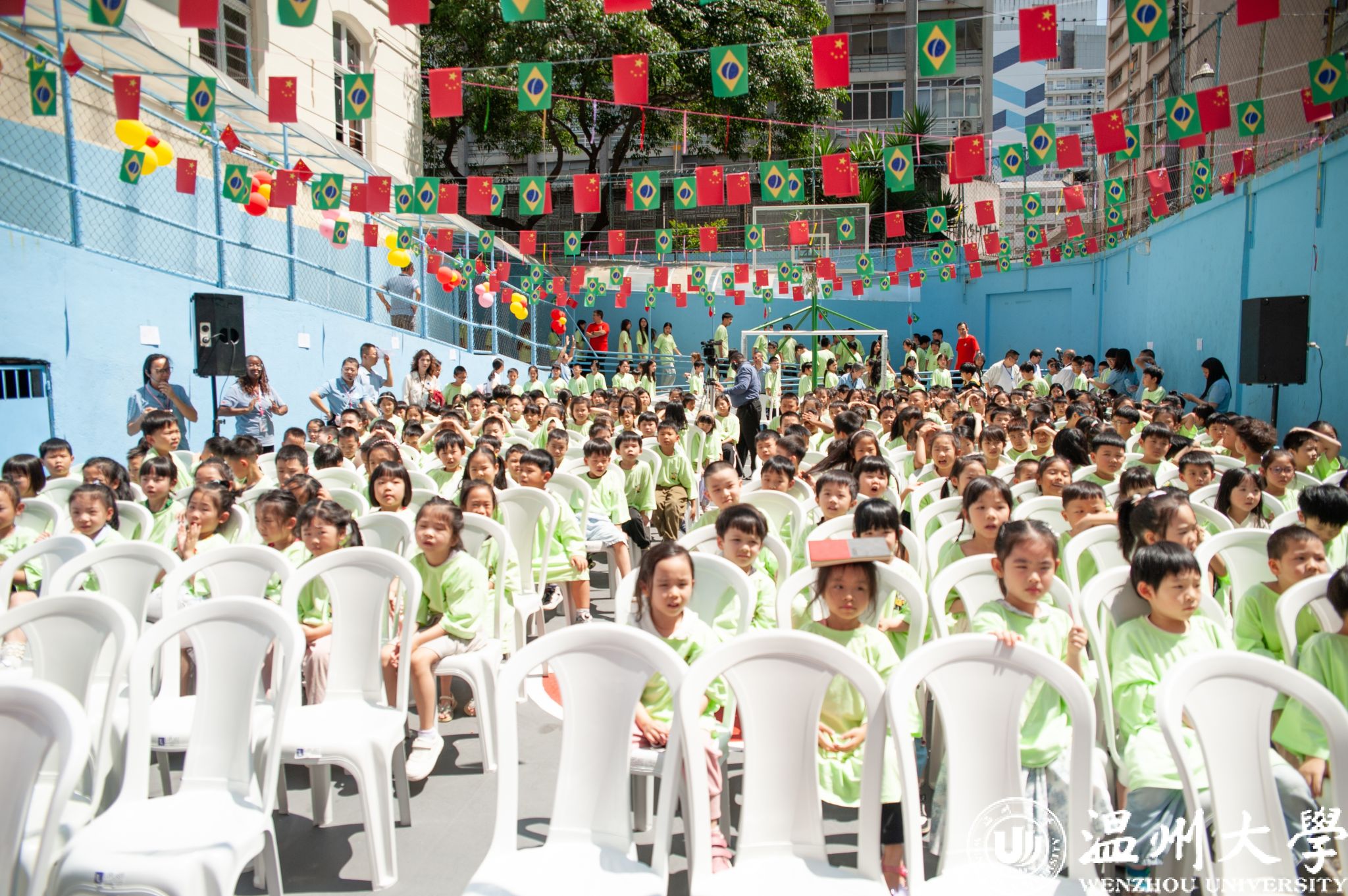 仪式伊始,全场起立,奏唱中巴两国国歌。营员孩子们嘹亮的歌声响彻圣保罗上空,瞬间将现场气氛推向高潮,成为开营仪式最动人的时刻之一。开营仪式上,温州大学“中华文化大乐园”代表团负责人在致辞中表示,温州大学是一所“侨”特色鲜明、为侨服务的高水平大学,近年来充分发挥侨教育、侨研究、侨文化优势,积极推进全球华文教育合作,打造了“教师、学生、家长”三位一体家校共育华文教育体系,深受海外华裔青少年好评。本次活动以“寻根中华,共筑未来”为主题,旨在通过丰富多彩、寓教于乐的形式,为华裔青少年提供深入了解祖(籍)国文化、体验中华文化魅力的机会,希望参营的华裔青少年做中华文化的学习者、文化传播的践行者。