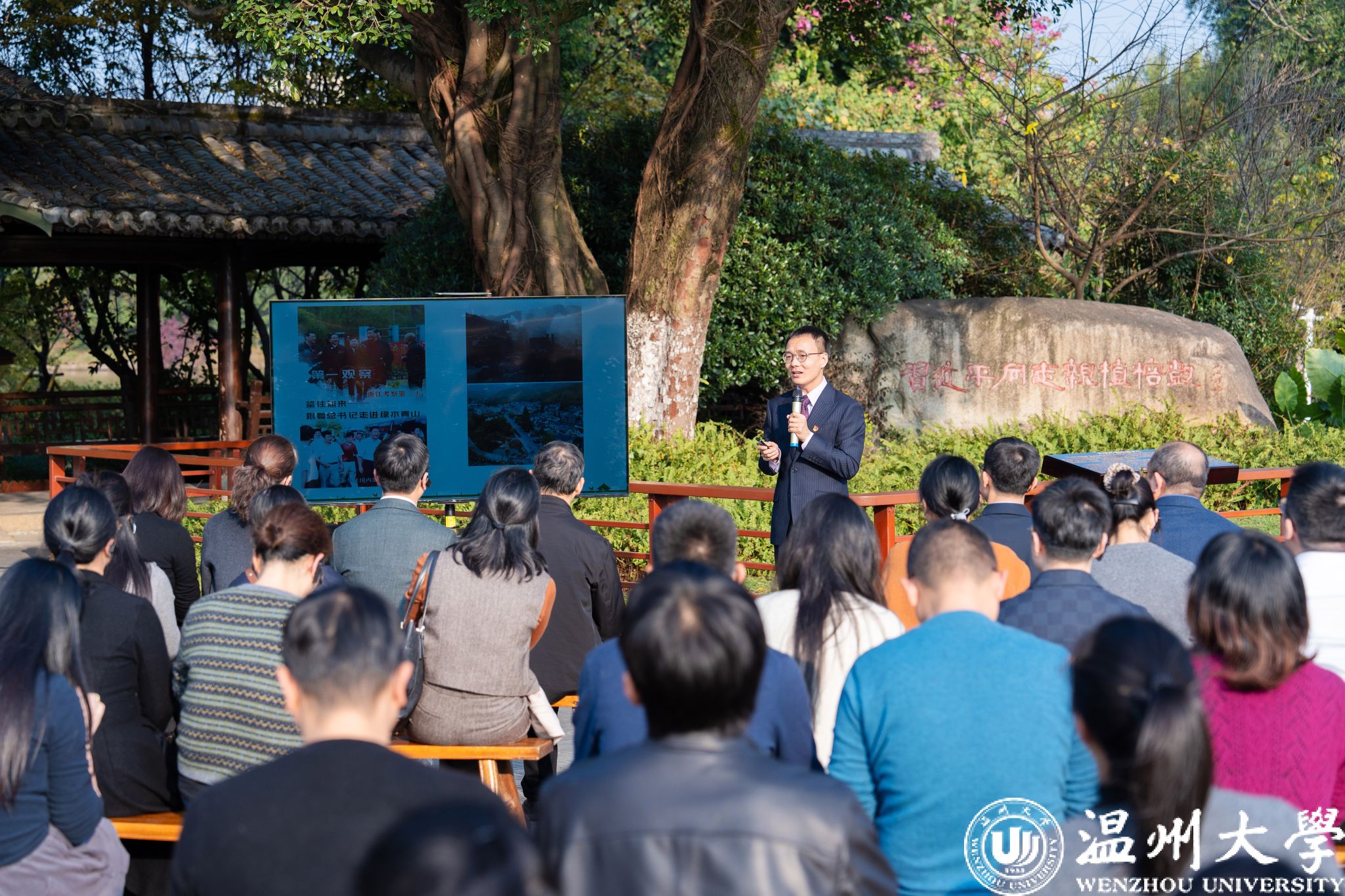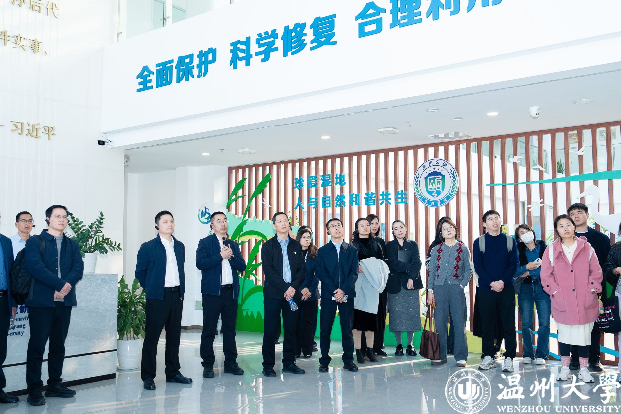 会后,全体与会人员赴温州大学三垟湿地生态环境研究院开展实地研学,考察党建引领优势特色学科与高水平团队践行生态文明思想、服务区域生态建设的实践样板,沉浸式感受“党建红”引领“生态绿”生动实践。在习近平总书记亲植榕树下,与会人员聆听专题党课,循着生态文明建设实践足迹,深入感悟习近平生态文明思想的真理力量与实践伟力。