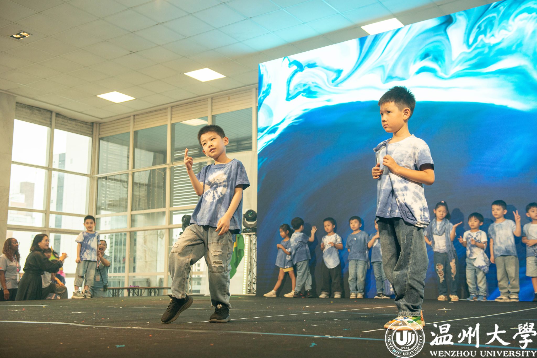 温州大学附属实验幼儿园郑向红老师、施晓洁老师指导幼儿扎染走秀《扎染焕新彩 童心传非遗》,孩子们身着亲手参与制作的扎染服饰,稚嫩身影与传统扎染相映成趣,让非遗之美在童真中扎根,传递中华文化的活力。