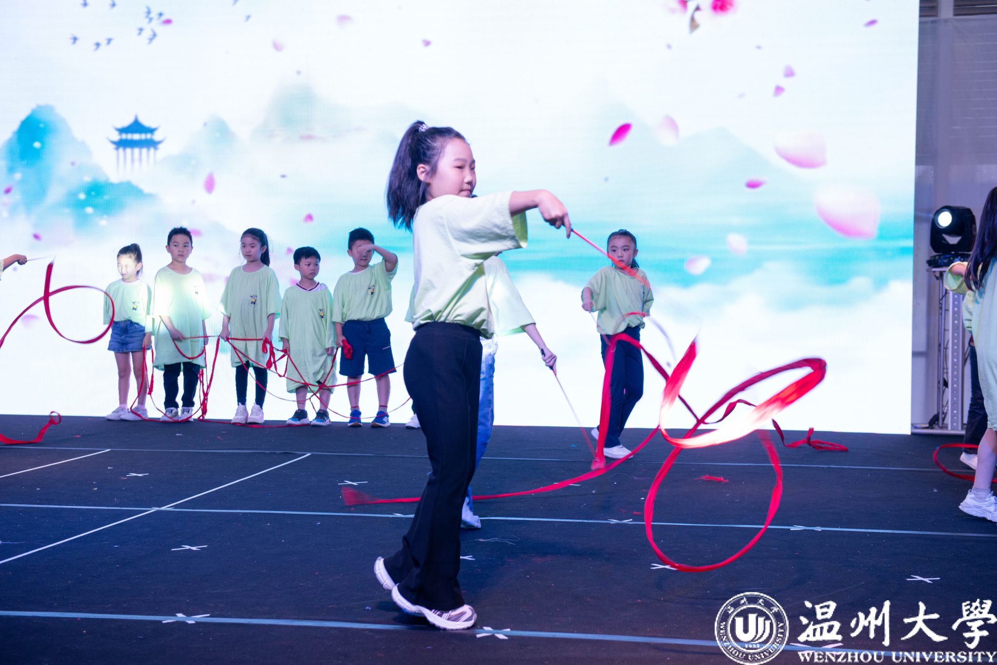 体育与健康学院滕紫彤老师指导的艺术体操彩带《万疆》,红色的彩带在孩子们手中飞扬,缓缓展开一幅跨越万里的画卷。