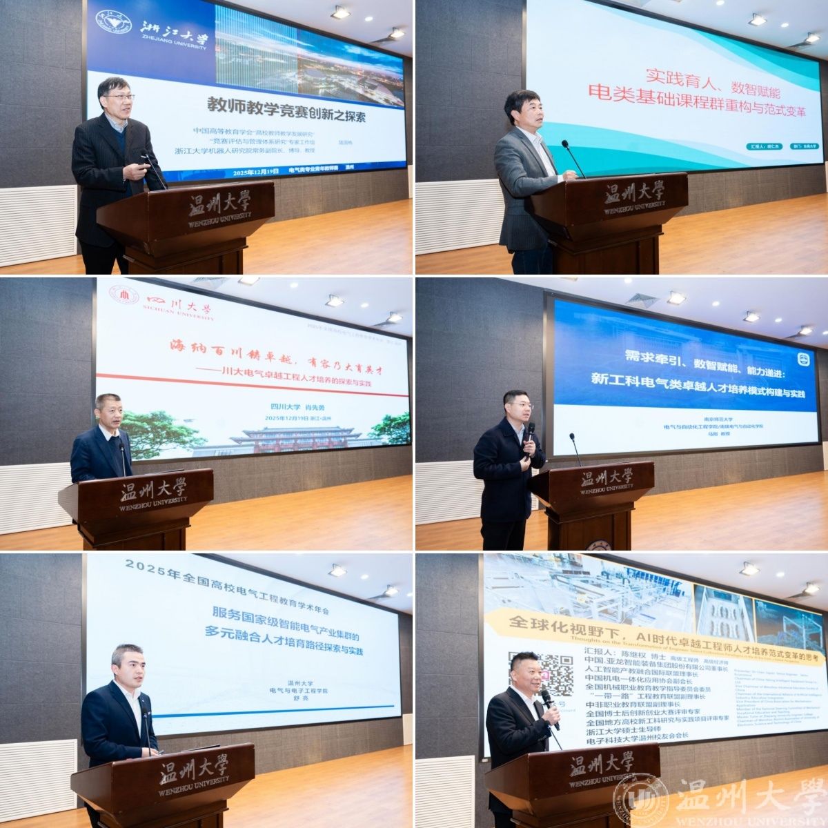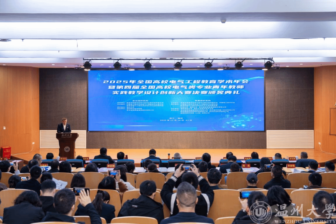 12月16日至21日,2025年全国高校电气工程教育学术年会暨第四届全国高校电气类专业青年教师实践教学设计创新大赛决赛在我校举办。大赛由教育部高等学校电气类专业教学指导委员会、中国电工技术学会主办,中国电工技术学会电气工程教育专业委员会、教育部电气工程及其自动化虚拟教研室、东南大学、温州大学、亚龙智能装备集团股份有限公司承办,学术年会由中国电工技术学会电气工程教育专业委员会、教育部电气工程及其自动化专业虚拟教研室主办,我校承办。来自清华大学等全国222所高校的专家学者、青年教师及参赛师生代表450余人齐聚温州大学,共同探索电气工程教育创新和人才培养质量提升路径。