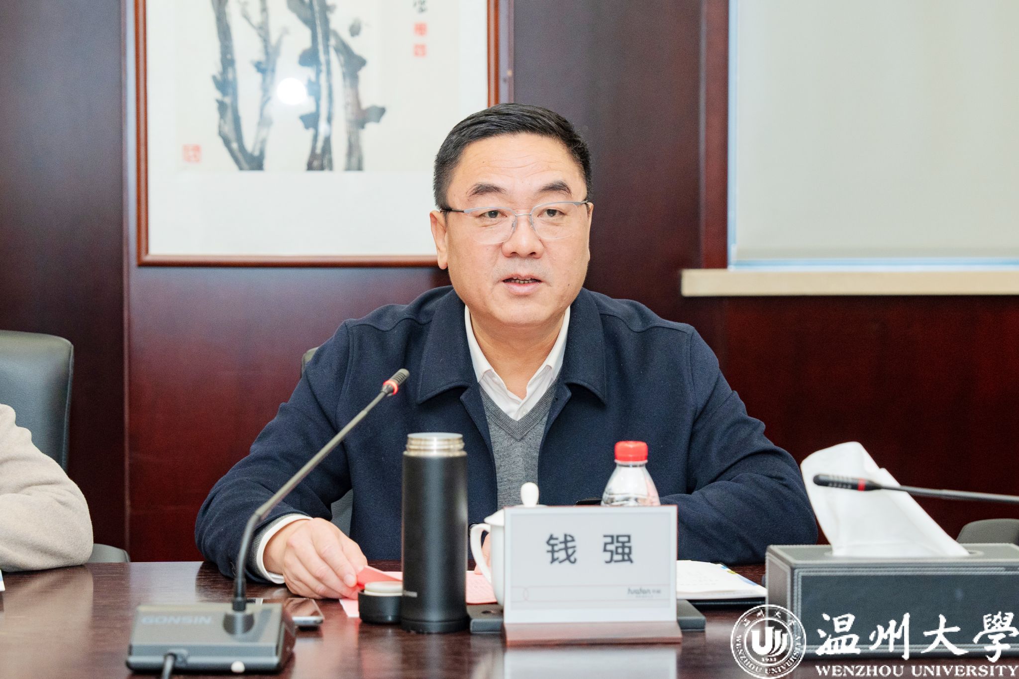 钱强书记代表温州大学全体师生,向华峰集团长期以来给予学校的关心支持表示衷心感谢。钱强指出,华峰集团作为行业标杆,不仅实力雄厚,更兼具高度的社会责任感,与温州大学结下了深厚情谊。多年来,集团出资设立“华峰品德奖”并增资助力品牌建设,捐资建成国内高校首个国旗教育主题广场,支持校园阅读驿站等文化设施建设,在品德育人、红色文化培育等方面给予学校大力支持。在协同育人方面,双方联合开设“华峰班”,共建协同创新中心,为学生实践成才和学校学科发展提供了有力支撑。他表示,当前温州大学正处于争创高水平大学和“双一流”高校的关键时期,希望以此次走访为契机,与华峰集团在人才联合培养、科研项目攻关、校园文化共建等领域拓宽合作维度、深化合作内涵,实现优势互补、互利共赢。