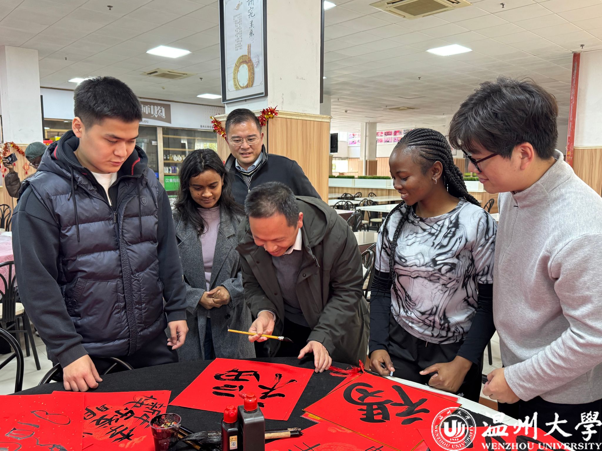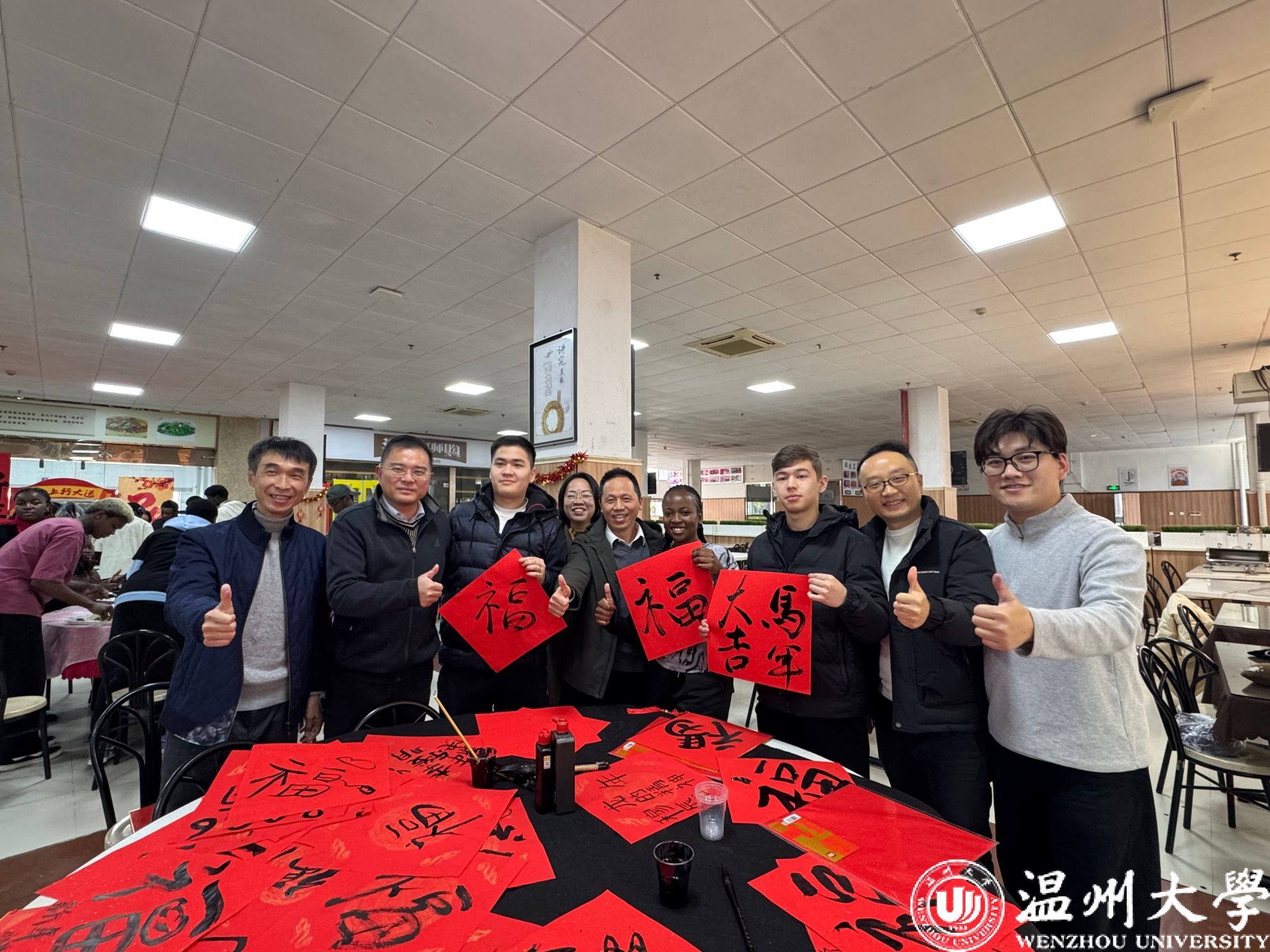 2月10日,温州大学南校区怡口乐餐厅暖意融融、年味升腾。学校党委副书记庄兴忠,副校长王舜,学工部、研工部、公共管理处、留管部及相关学院负责人与50余名留校中外学子欢聚一堂,通过包饺子、写春联、趣投壶等活动,沉浸式体验传统民俗文化,共庆中国新年。