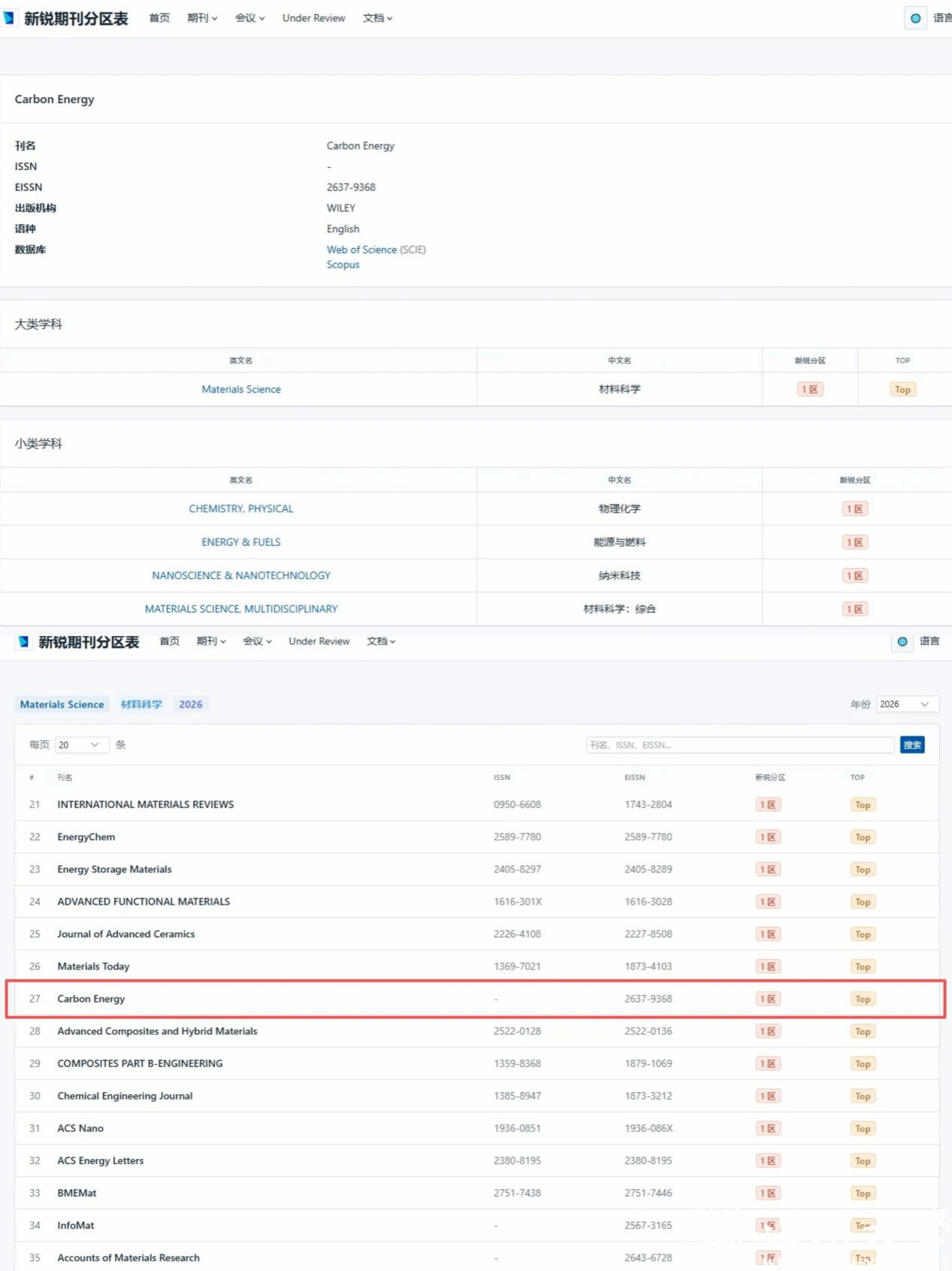 近日,2026版新锐期刊分区表正式发布。我校与国际知名出版机构Wiley联合主办的《碳能源(英文)》(Carbon Energy)成功入选材料科学1区Top期刊,在物理化学、能源与燃料、纳米科技、材料科学-综合等四大核心学科跻身1区,在材料科学领域510本参评期刊中位列第27位,彰显我校碳能源领域学科实力。