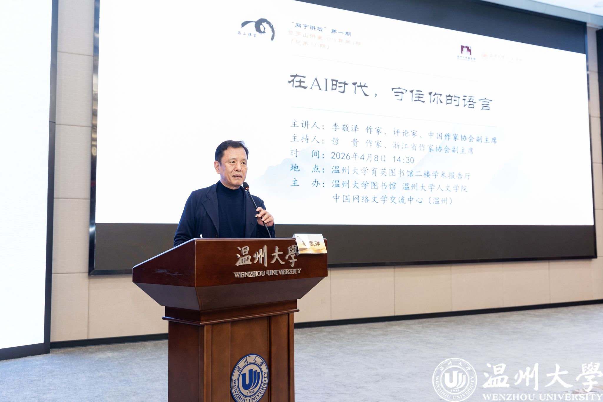 4月8日下午,著名作家、评论家、中国作家协会副主席李敬泽应邀莅临温州大学,为师生带来题为《在AI时代,守住你的语言》的专题讲座。本次活动由温州大学人文学院、温州大学图书馆、中国网络文学交流中心(温州)及温州大学中国网文国际传播研究院共同主办。温州大学校长赵敏出席并致辞。众多师生齐聚育英图书馆学术报告厅,共探人工智能浪潮下语言与人文的坚守之道。活动由浙江省作家协会副主席哲贵主持。