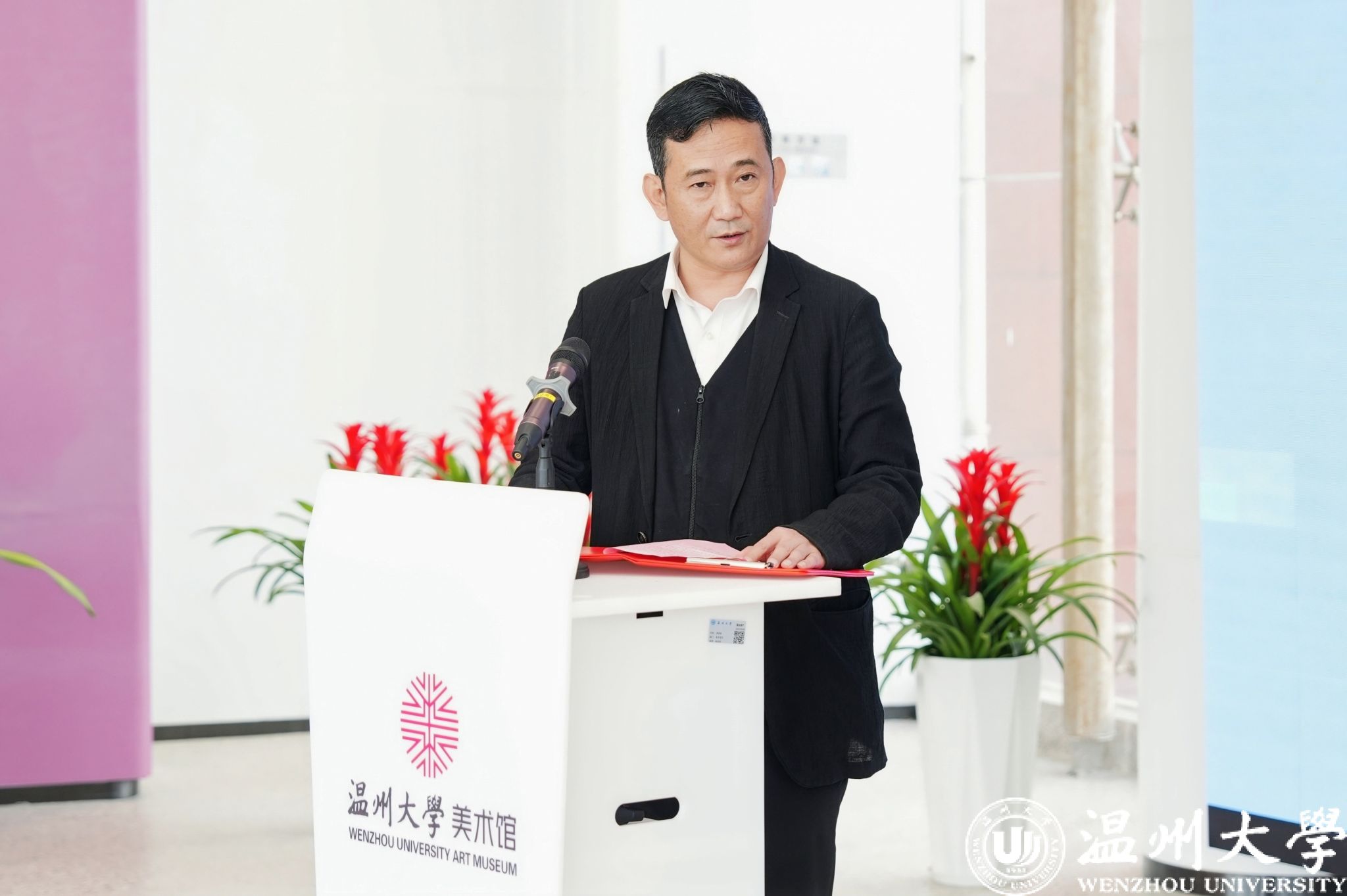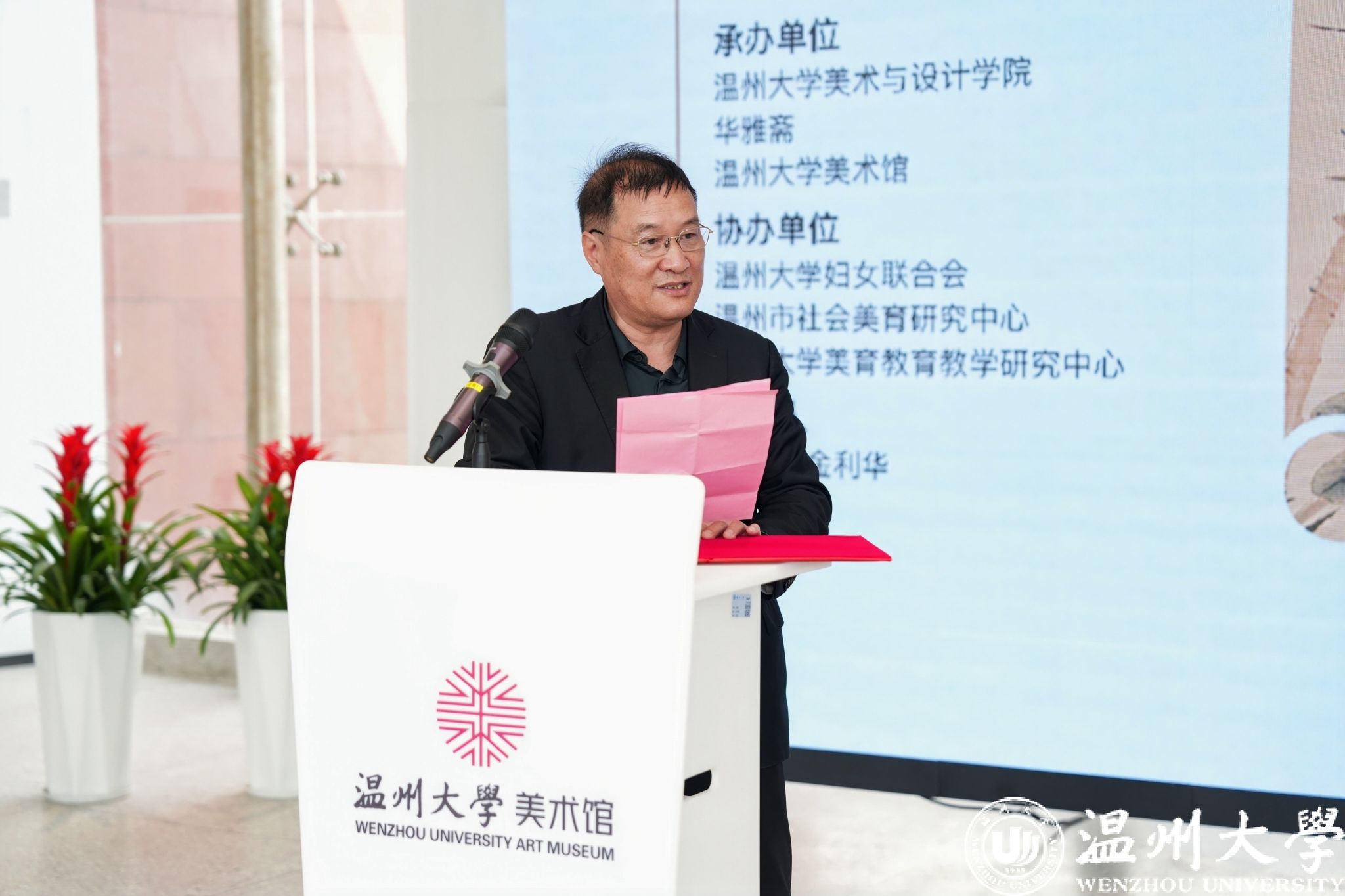 温州大学党委书记钱强,温州大学原党委书记陈艾华,浙江省文联副主席、温州市文联党组书记、主席、二级巡视员周新波,温州市文化广电旅游局二级巡视员张志宏,温州大学党委委员、副校长王军,温州市文联党组成员、副主席吕呈力,温州市文化馆副馆长林贤埃,温州市文化馆视觉艺术与拓展部主任曾春玲,衍园美术馆馆长沈国林,华雅斋美术馆馆长、策展人金利华,学校相关部门、学院负责人及师生代表共同出席仪式。活动由美术与设计学院负责人主持。
