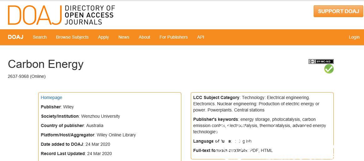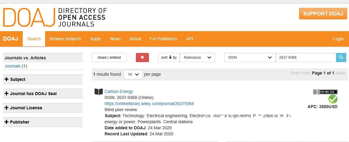 我校主办的CarbonEnergy期刊通过全球最具影响力的开放存取期刊目录(Directory of Open Access Journals,DOAJ)评估后,于3月24日被DOAJ数据库正式收录(查询地址:https://doaj.org/)。