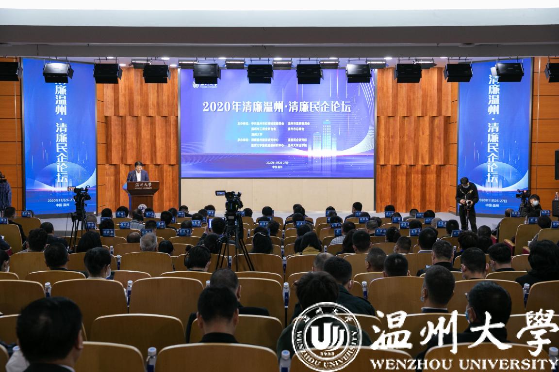 11月27日,由温州市纪委市监委、市工商联、市总商会、温州大学联合主办的2020年清廉温州·清廉民企论坛在我校召开。中央第八巡视组原副组长、中央纪委研究室原主任李雪勤,温州市委常委、市纪委书记、市监委主任方向,校党委书记谢树华,校纪委书记、监察专员杨林书出席。来自全国部分地方纪检监察机关、工商联、温州市市县纪委领导和行业协会商会、清廉民企联盟会员企业代表、全国廉政建设领域知名专家学者和我校纪委、法学院、廉政建设研究中心、二级学院纪委相关负责人等300余位嘉宾参加了论坛。