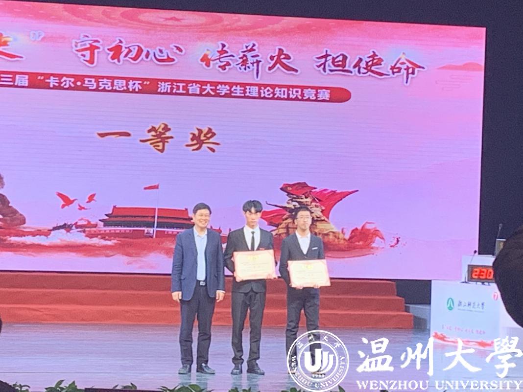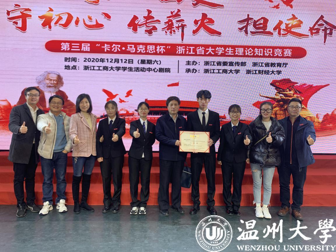 12月12日上午,由省委宣传部、省教育厅主办,浙江工商大学、浙江财经大学承办的第三届“卡尔·马克思杯”浙江省大学生理论知识竞赛圆满落幕,温州大学代表队荣获一等奖和优秀组织奖,创历史最好成绩。这是我校连续第三年进入决赛,连续两年获得优秀组织奖。我校比赛答题率和答题质量表现突出,答题率接近100%,居全省首位,为全省入围决赛的10所本科高校之一。