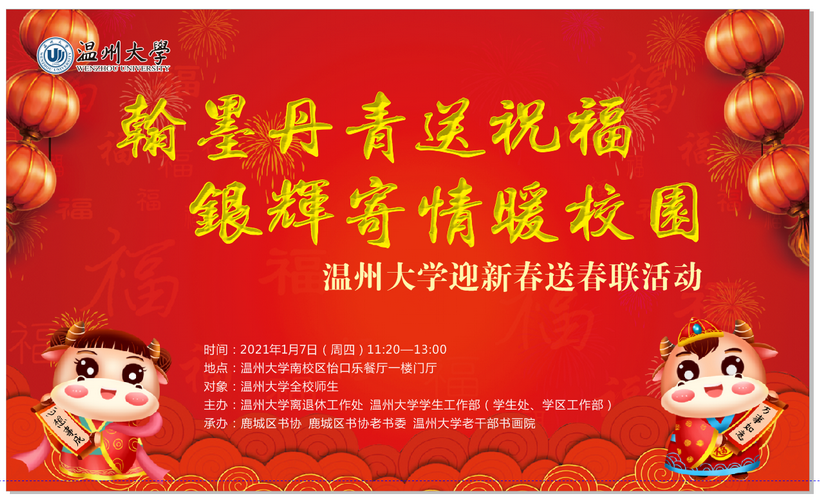 笑脸盈面迎新春,笔墨含香纳新福。1月7日,我校迎新春送春联活动在学校南校区怡口乐餐厅顺利举办。此次活动由温州大学离退休工作处、温州大学学生工作部(学生处学区工作部)主办,鹿城区书协、鹿城区书协老书委和温州大学老干部书画院承办。这是老干部书画院第四年送文化进校园开展迎新春送春联活动。