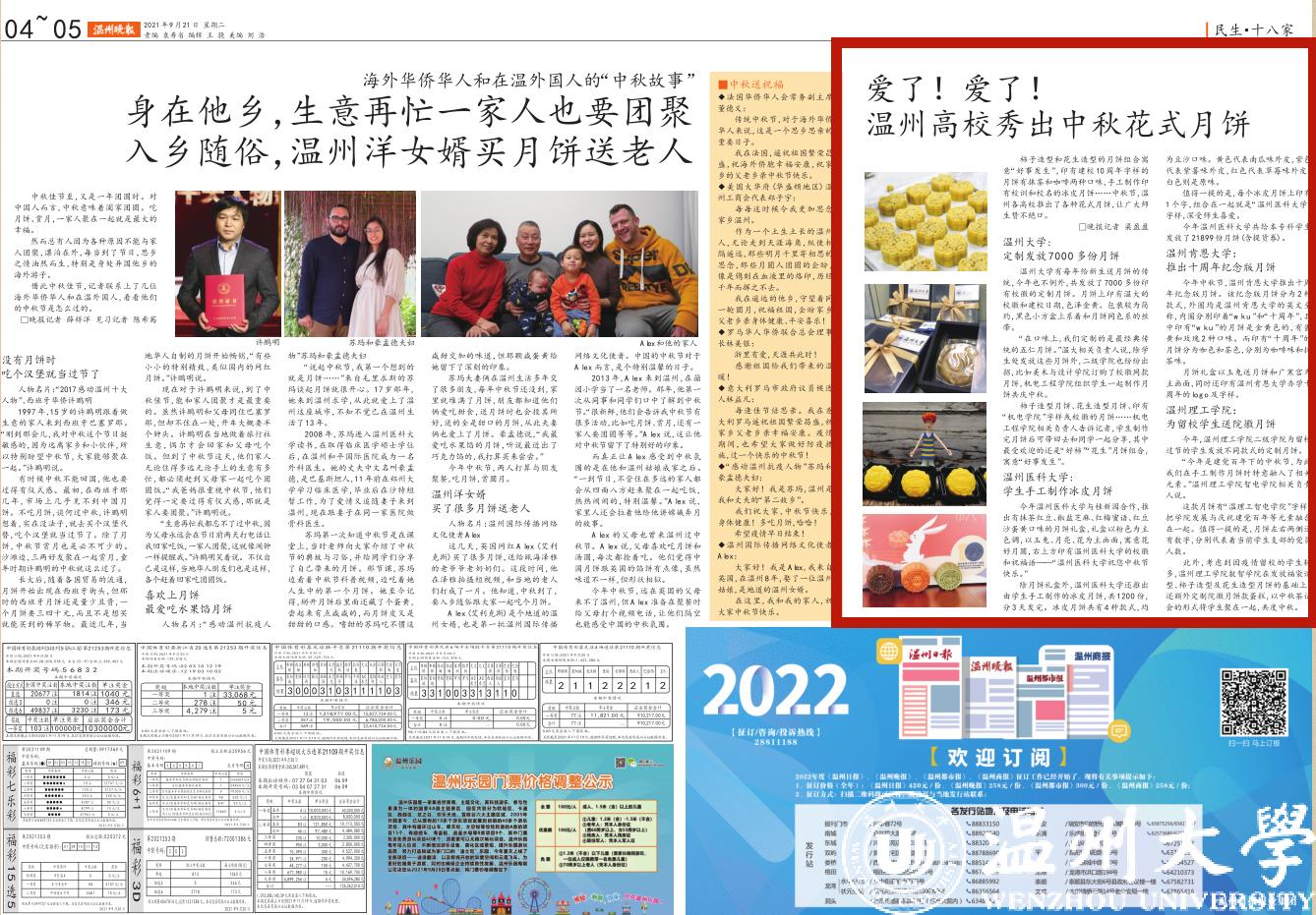柿子造型和花生造型的月饼组合寓意“好事发生”手工制作印有校训和校名的冰皮月饼⋯⋯中秋节,温州大学推出了各种花式月饼,让广大师生赞不绝口。