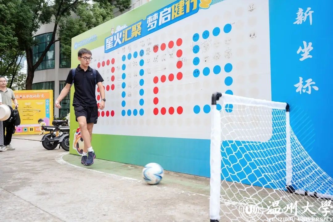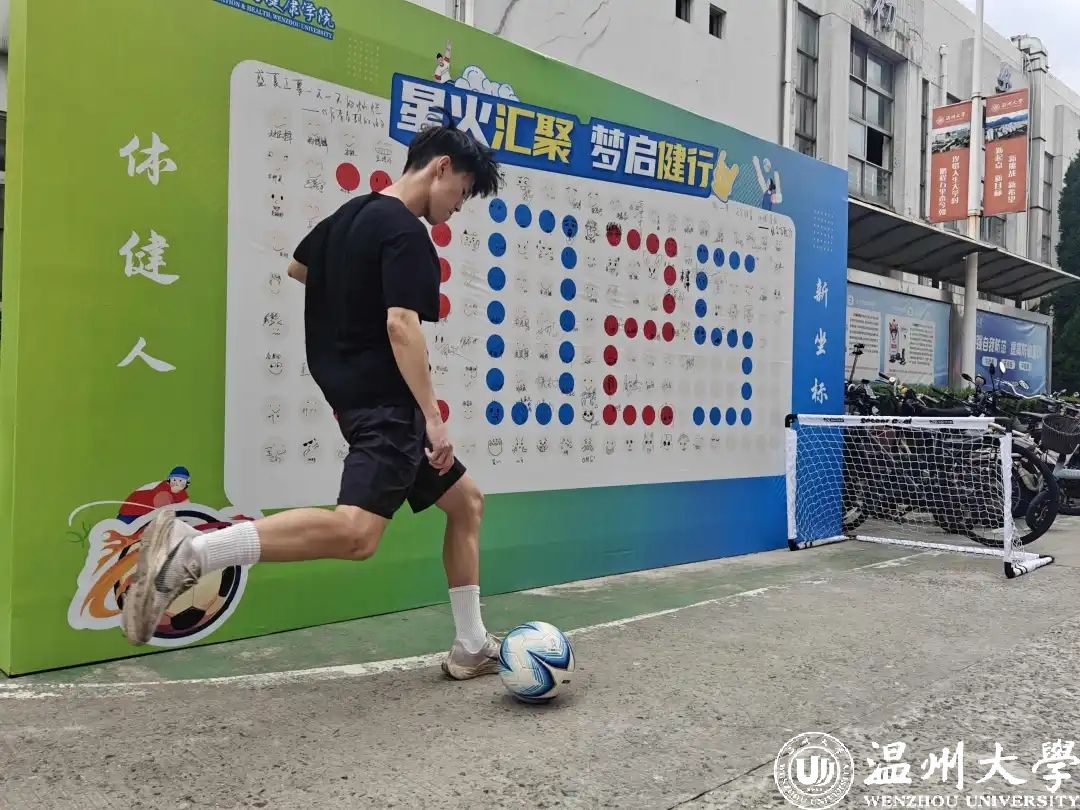 看,这里的迎新现场化身迷你足球赛场。日前,温州大学体育与健康学院足球运动专业迎来首批21名新生,在现场设置的小型球门前,新生们大显身手,展现球技,用漂亮的弧度打开大学生活的大门。