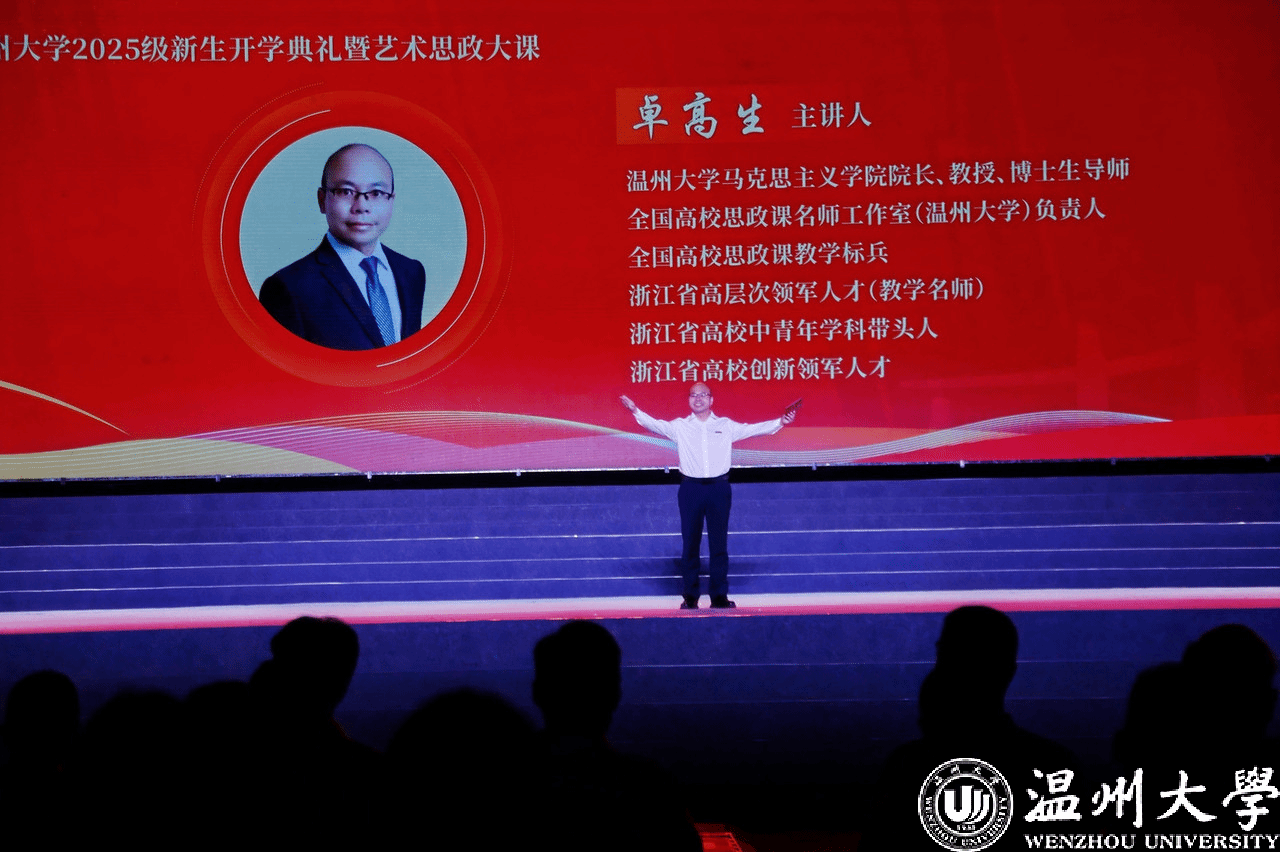 艺术思政大课由全国高校思政课名师工作室(温州大学)负责人、温州大学马克思主义学院院长卓高生教授主讲。温州大学全体校领导,各学院、相关部门负责人,新生班主任、全体辅导员,2025级新生,教师代表、校友代表等参加了本次艺术思政大课。