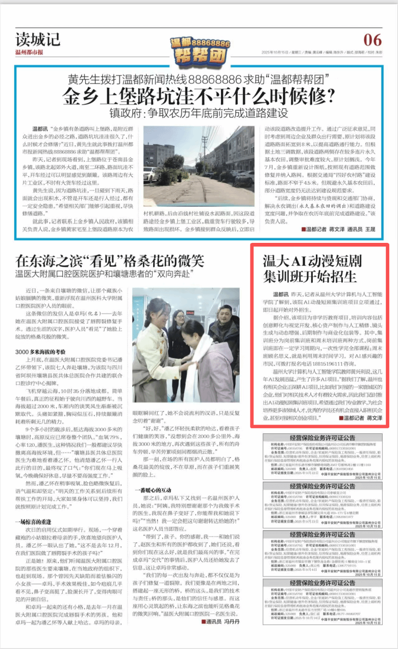 10月14日,记者从温州大学计算机与人工智能学院了解到,该院AI动漫短剧集训班项目立项通过,即日起开始对外招生。