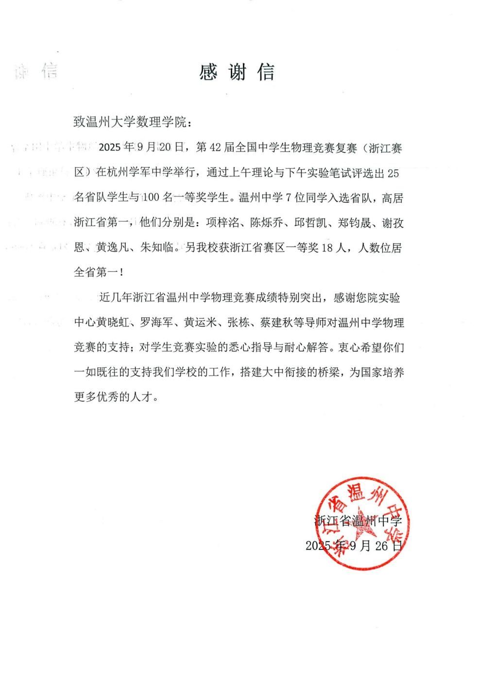 近日,温州大学数理学院再次收到来自浙江省温州中学的感谢信,对学院长期支持物理竞赛辅导工作表示感谢。在刚刚结束的第42届全国中学生物理竞赛复赛(浙江赛区)中,温州中学7名学生入选省队、18名学生获浙江省一等奖,两项成绩均位居全省第一。