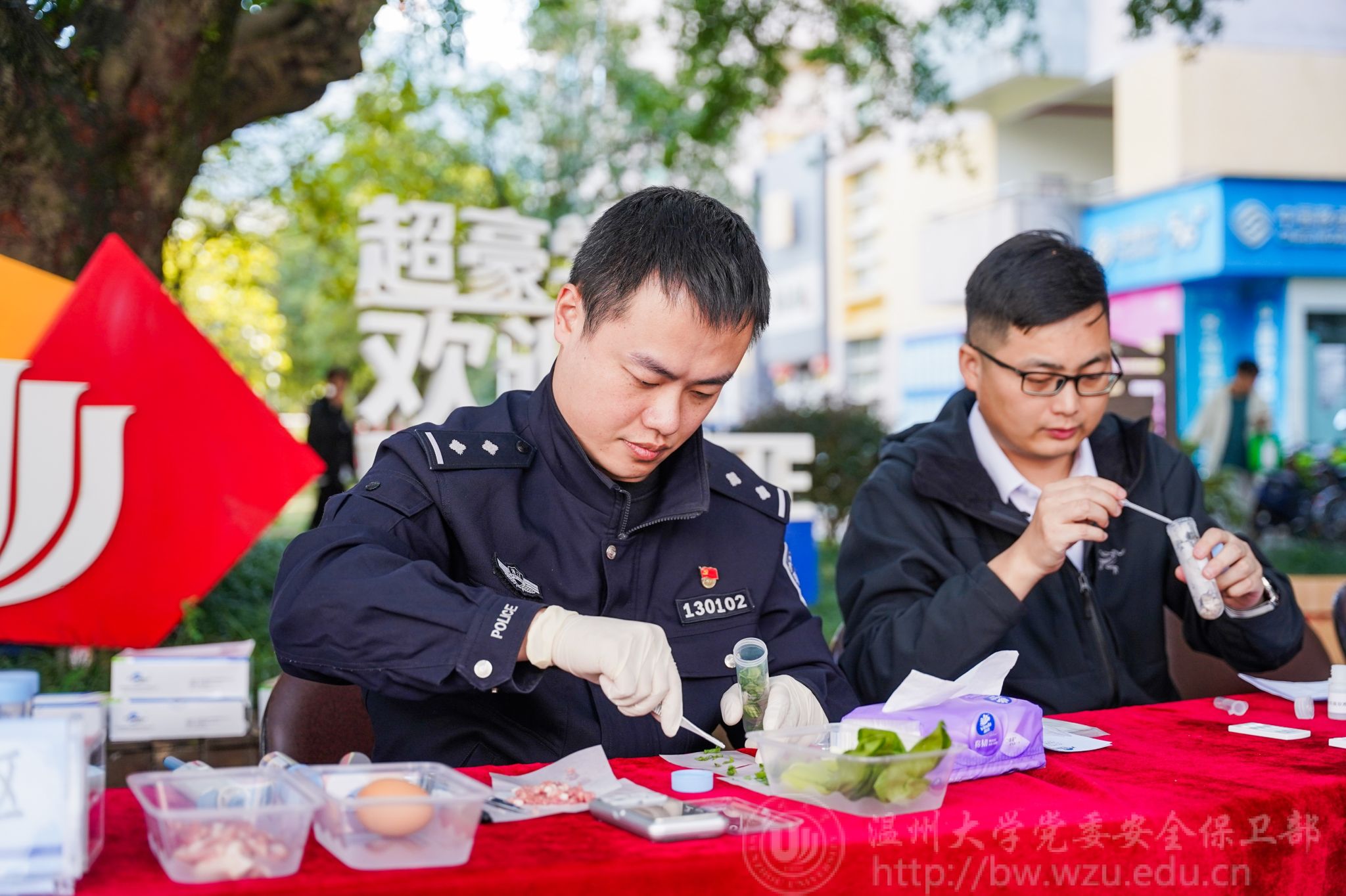 10月29日下午,“食安进校园,校警共行动”普法快检双服务活动在温州大学学生公寓E区反诈树文化广场举行。