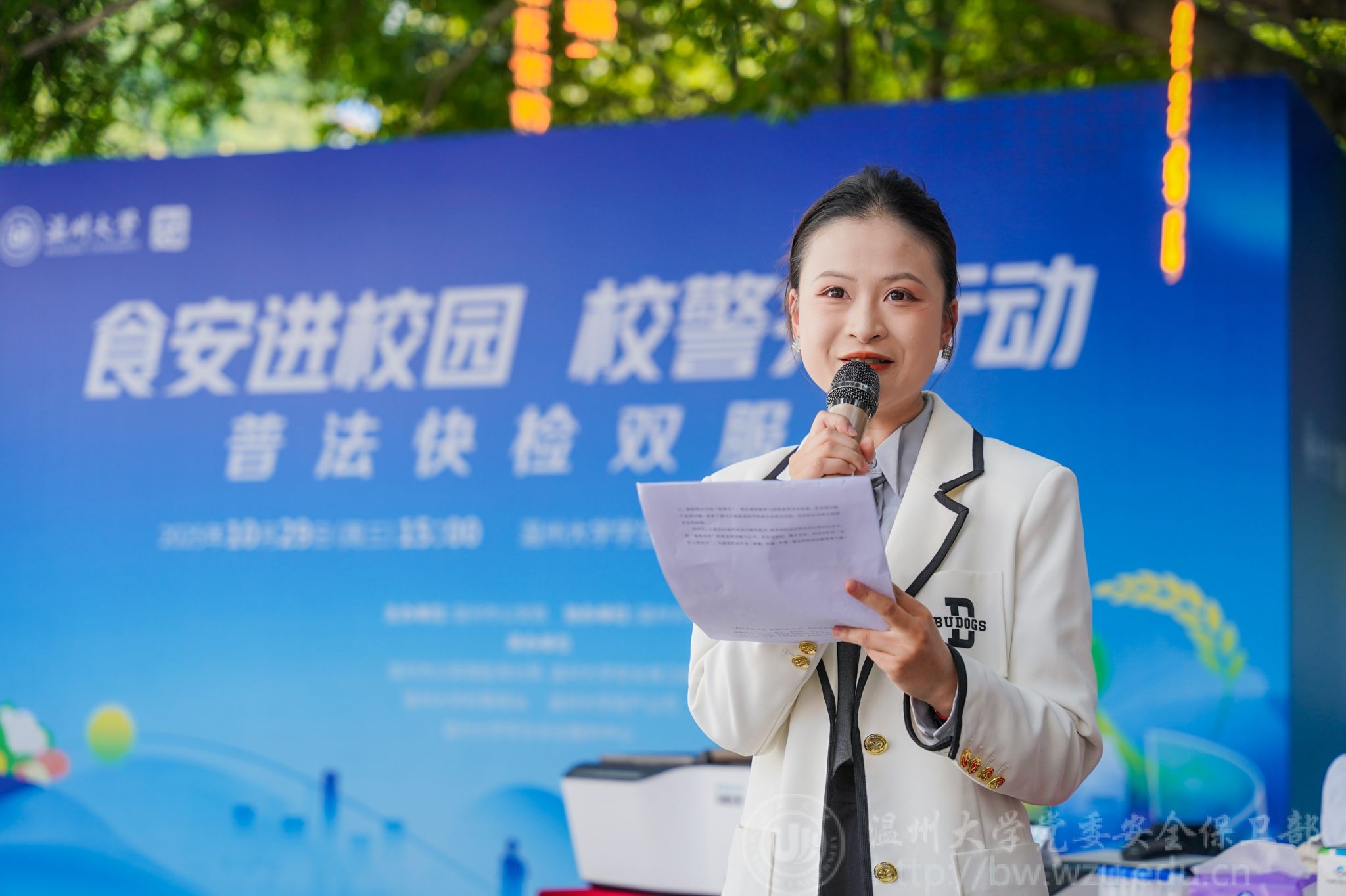 活动伊始,温州大学学生代表潘奕瑶作倡议发言。她从“增强食药安全意识、践行健康生活方式、勇担校园监督责任”三个方面发出号召,呼吁全体同学共同筑牢校园食药安全防线。
