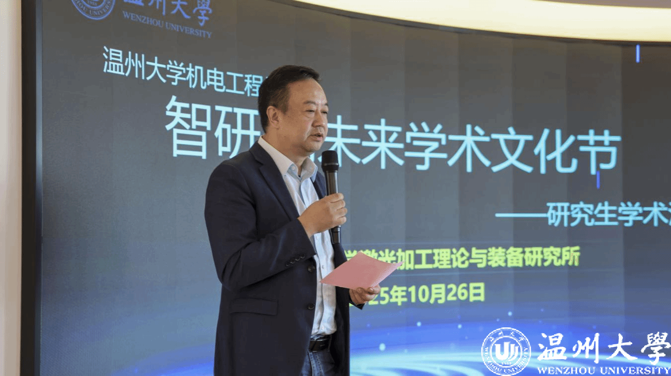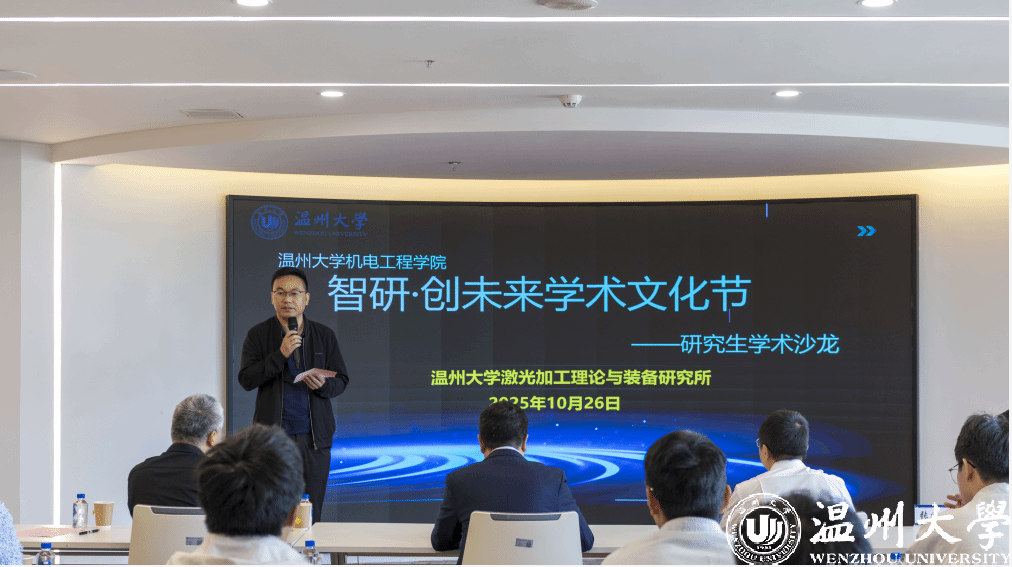 为贯彻落实党的二十届四中全会精神,在2025年世界青年科学家峰会召开之际,温州大学机电工程学院师生深入学习领会党的二十届四中全会精神,参与世界青年科学家峰会平行分论坛,了解国家发展战略目标与科技动态,立足温州经济社会发展,于10月26日在科技综合大楼515路演厅举办“智研・创未来”学术文化节暨研究生学术沙龙。此次活动由温州大学机电工程学院主办,温州大学激光加工理论与装备研究所承办,机电工程学院院长向家伟、研究生院副院长李勇,机电工程学院副院长朱德华、张斌斌,创新创业学院创新创业科科长李剑军等五十余名师生参与研讨。
