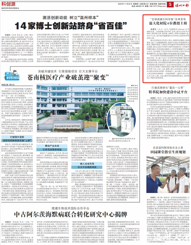 温大化材院有关负责人表示,该院四位教授入选该榜单,是个人长期深耕科研、持续产出高水平成果的实力彰显,更集中体现了该院在学科建设中的深厚积淀与突出成效。他们以高水平科研引领学科发展方向,为学院学科梯队建设、科研创新突破和人才培养质量提升注入核心动力,充分现了顶尖科学家对学科核心竞争力的关键支撑作用,也为温大整体学科发展奠定坚实基础。