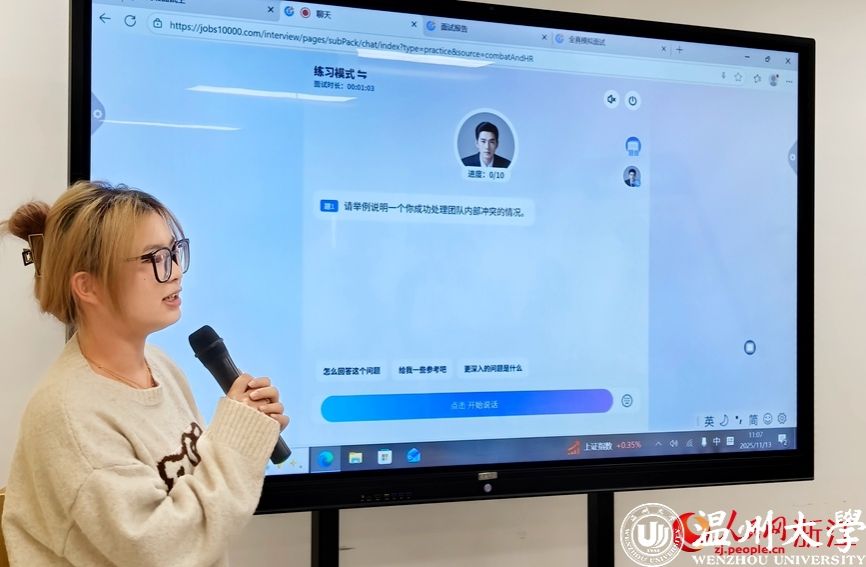 而在温州大学,AI化身为护航学子职业起飞的“生涯导师”。温州大学与人事部门打造的“就业汇”应用,集成在校数据与岗位信息,实现“一生一策”的精准服务。在AI面试实验室,研二学生洪珍妮经历了一场直击要害的模拟面试,AI面试官给出的改进意见让她受益匪浅。该校生涯教育科科长洪艳介绍,这套“AI初筛+名师优化”的高效闭环,已服务超过3800名学生。