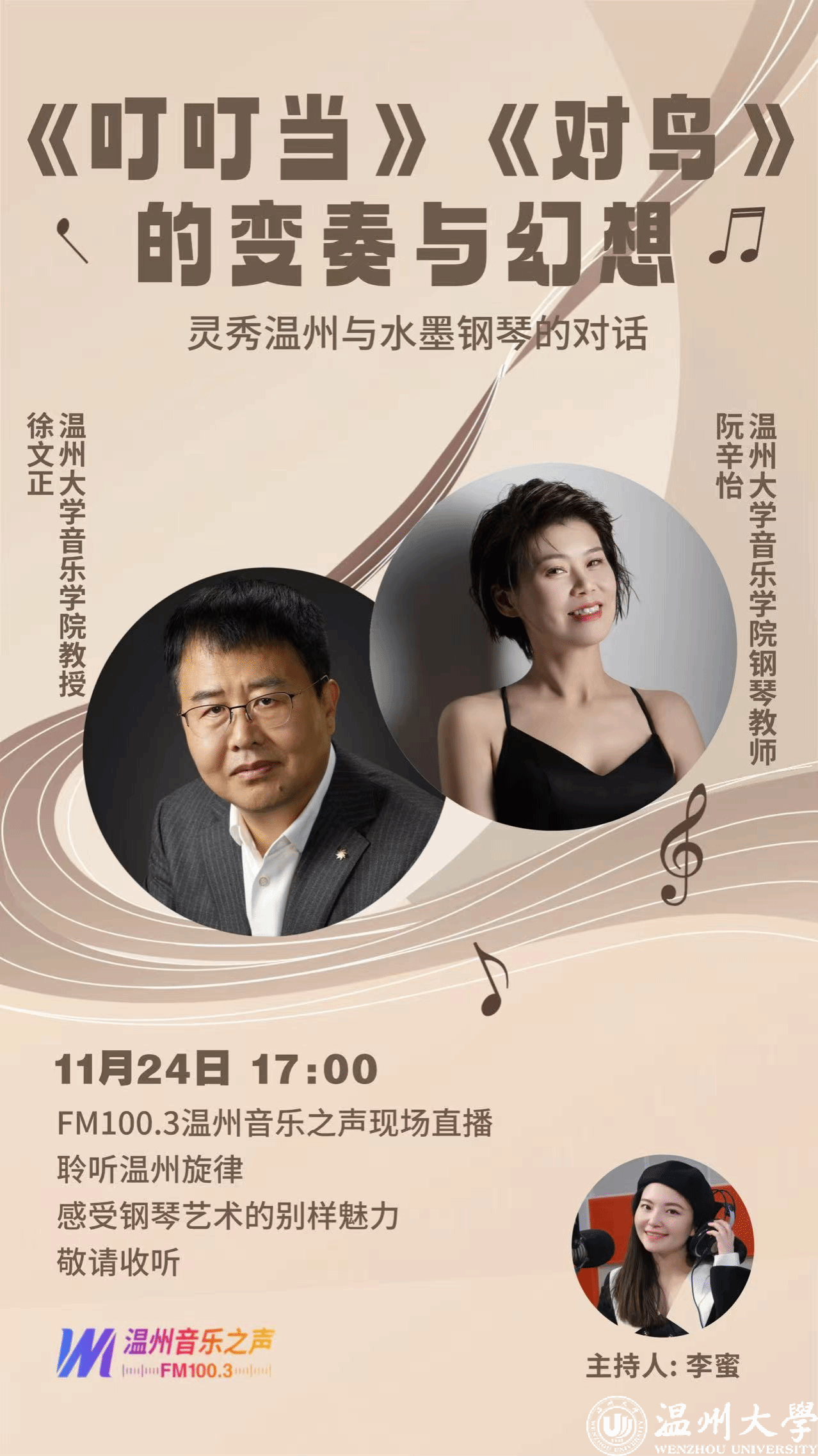 FM100.3温州音乐之声《音乐C大调》邀请这张新专辑的作曲和演奏——温州大学音乐学院教授徐文正、钢琴教师阮辛怡携手来到直播室,与主持人李蜜分享这场让温州文化"发声"的音乐盛宴背后的动人故事。
