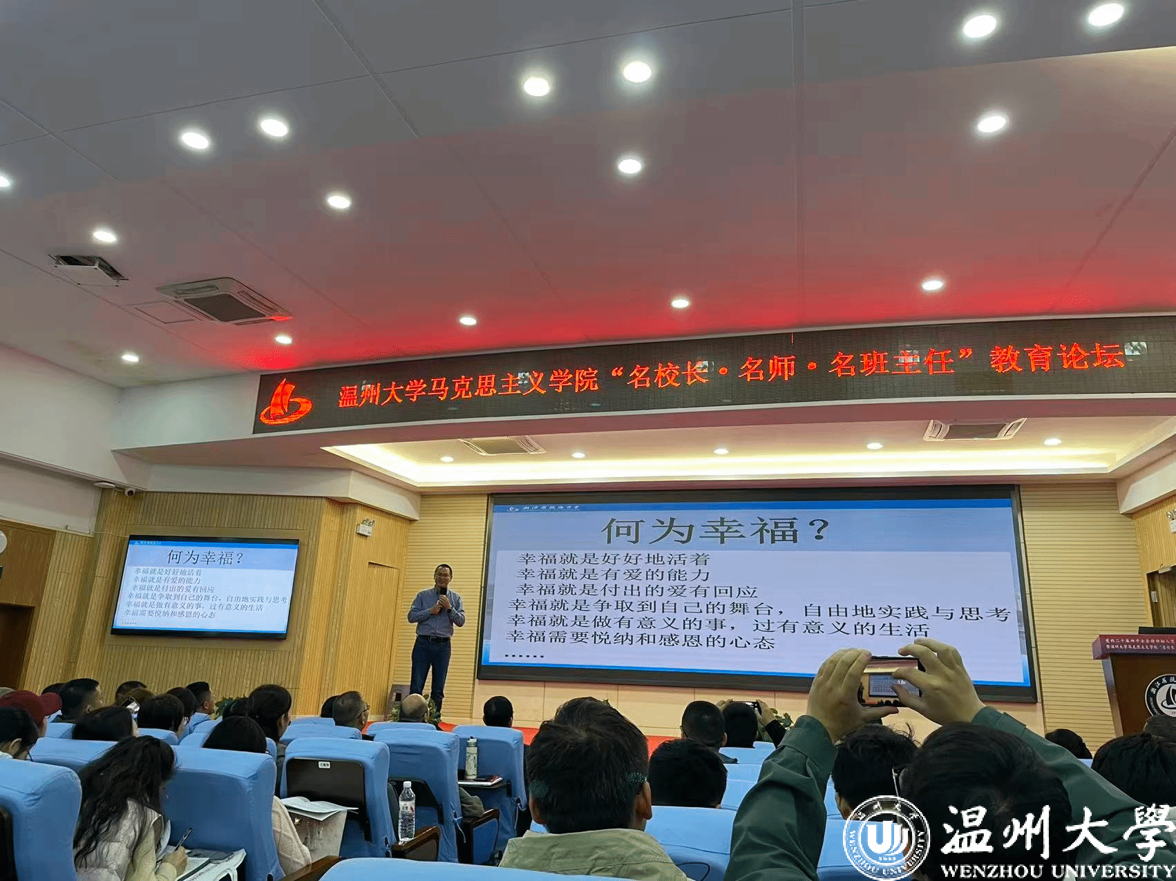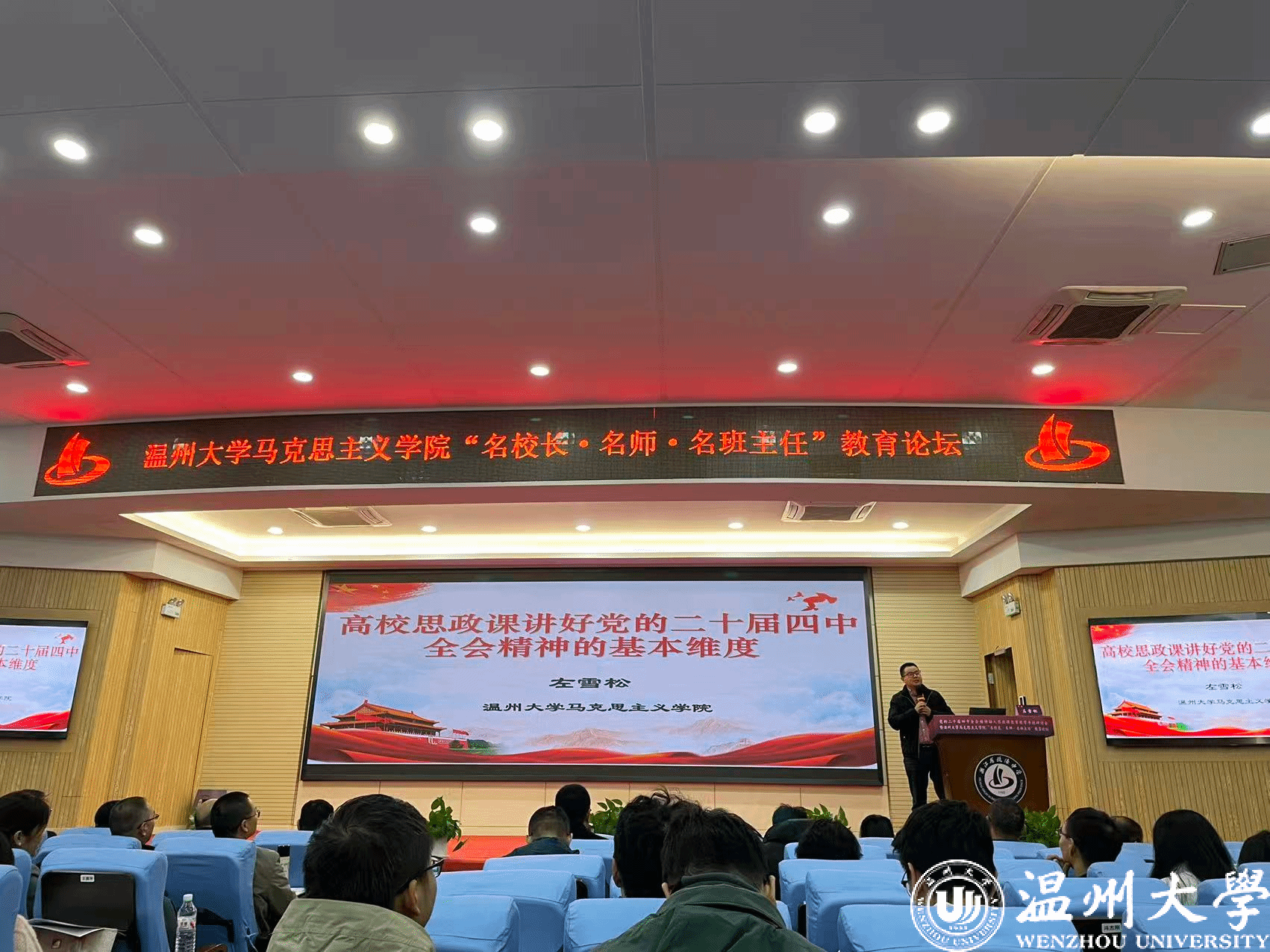 为深入学习贯彻党的二十届四中全会精神,推动党的最新理论融入思政课建设,推进大中小学思政教育一体化建设,搭建高校马院与中小学协同育人的平台,11月29日,党的二十届四中全会精神融入思政课教育教学专题研讨会暨温州大学马克思主义学院“名校长·名师·名班主任”教育论坛在瓯海中学举行。