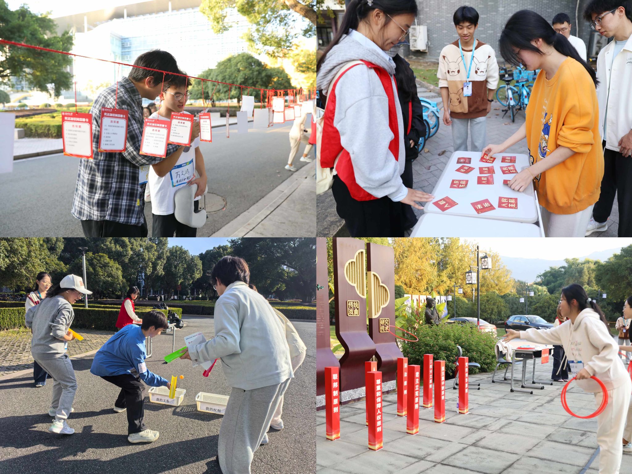 参赛队员手持地图穿梭在校园里,在奔跑与协作中完成“法治闯关”,让宪法学习从静态阅读变为动态实践。从旋律悠扬的宪法歌曲学唱点,到充满互动乐趣的法治大转盘;从聚焦民生热点的维权大作战,到考验知识储备的宪法知识问答;从层层递进的普法大冲关,到妙趣横生的宪法套圈答题,再到将运动与分类思维结合的宪法运球分类,多样玩法打破了宪法学习的“高冷”标签,为普法宣传持续注入“青春新料”,不少同学表示“这样学宪法,记得牢、有意义”。 这一次,让我们用脚步丈量宪法的温度,用行动诠释法治的活力!