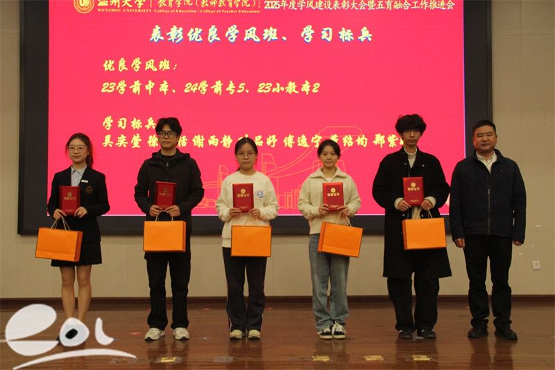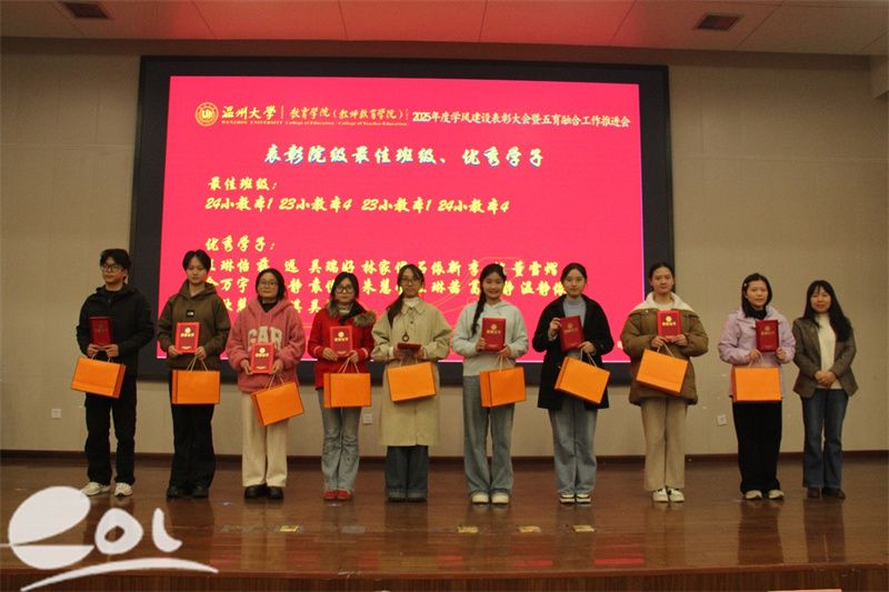 12月24日晚,温州大学教育学院2025年度学风建设表彰大会暨五育融合工作推进会在北校信息楼报告厅举行。学院领导、师生代表齐聚一堂,总结教育部立德树人综合改革试点院系实践经验,擘画五育融合育人新蓝图。