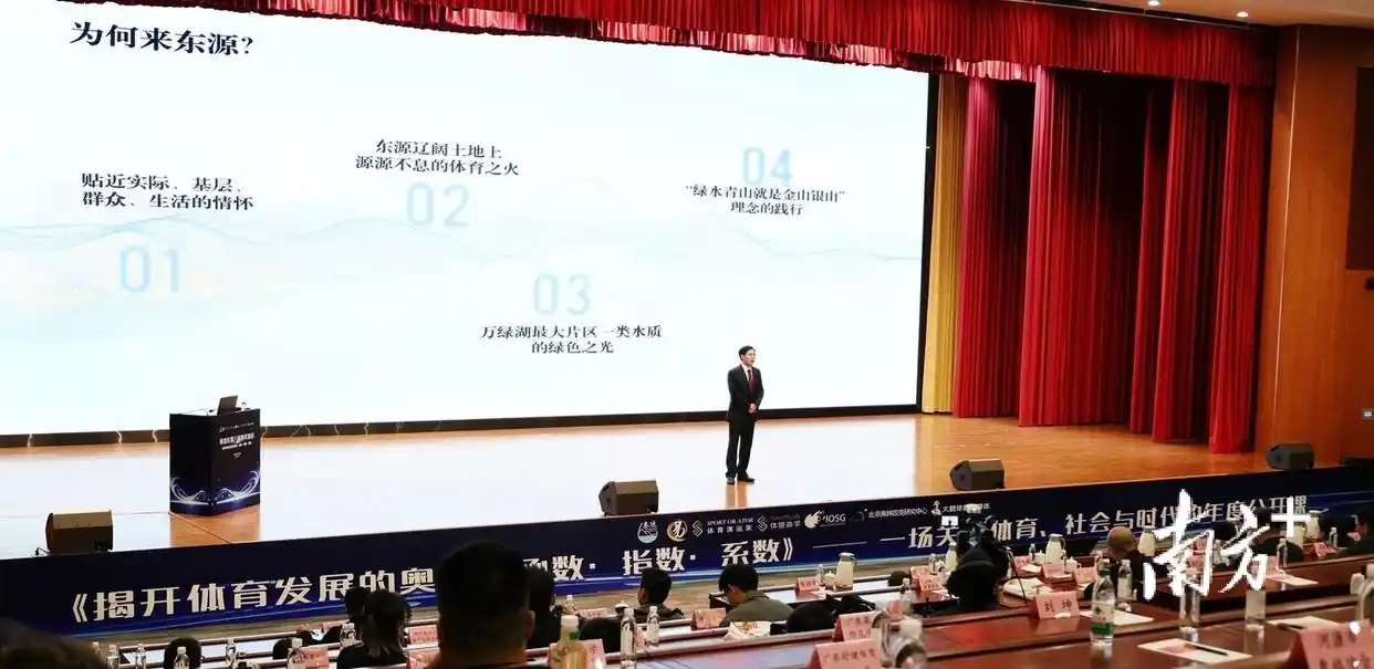 演讲之初,易剑东谈及本次演讲落地东源的原因。他认为,体育强国的根基在基层,活力在民间。而东源“山水资源丰富、群众体育基础好”,是县域体育赋能“百千万工程”与城乡融合的鲜活样本。