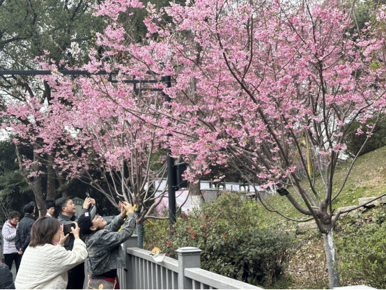 历经春雨滋养,园内早樱迎来全盛观赏期,粉樱如云、漫栈飘香。