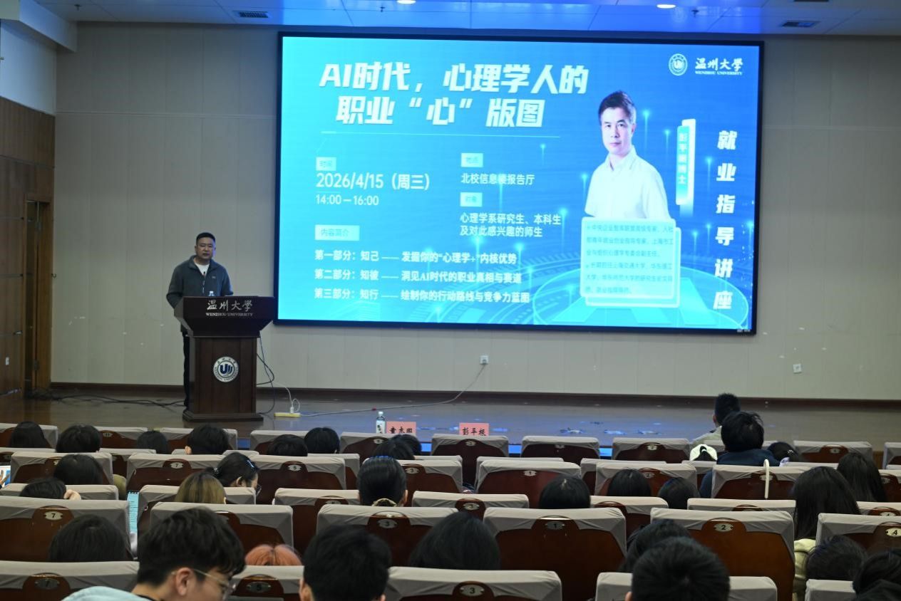 当AI、心理学遇上职业发展,会碰撞出什么样的火花?日前,温州大学教育学院特邀人社部青年就业创业指导专家、中央企业智库联盟高级专家彭平根博士,为心理学系全体本科生、研究生开展主题为《AI时代,心理学人的职业“心”版图》的就业指导讲座。本次讲座也是学院2026年第3期溯初大讲堂活动,由学院党委副书记兼纪委书记章志图主持。