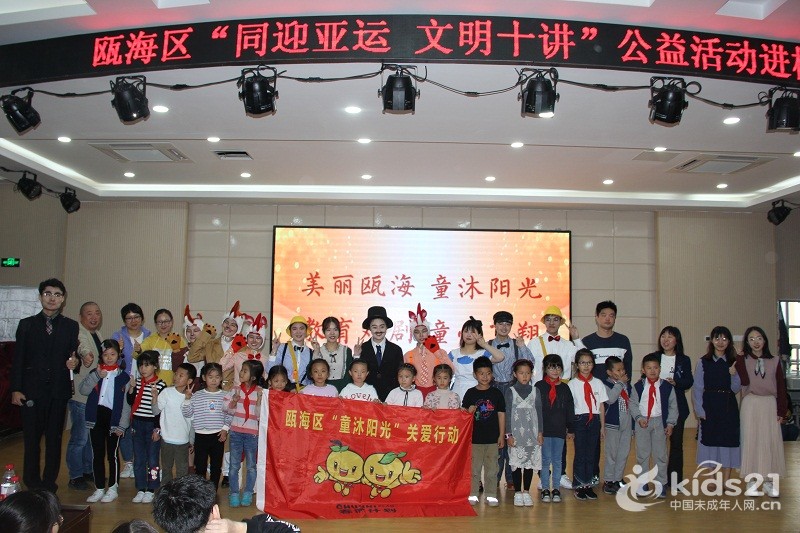 温州市瓯海区仙岩实验小学的大礼堂里爆发出阵阵掌声和欢呼声。为响应“同迎亚运 文明十讲”,发挥社会组织力量,助力美丽瓯海建设,10月30日下午,由温州市瓯海区精神文明建设指导中心主办的“童沐阳光”关爱行动特邀温州大学沐童翎教育戏剧社,为该校的新居民子女送去别开生面的礼物——《金色的脚印》课本剧表演。
