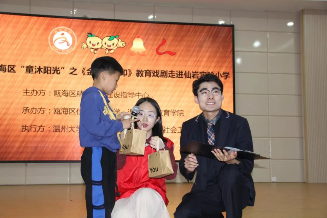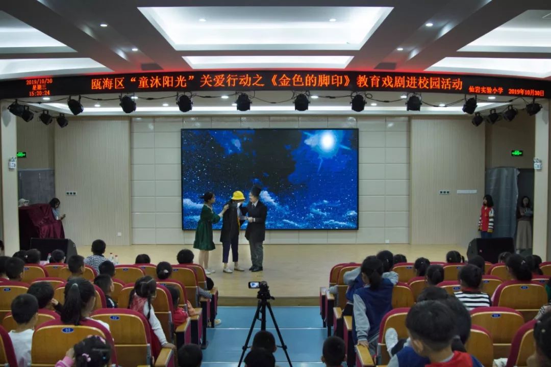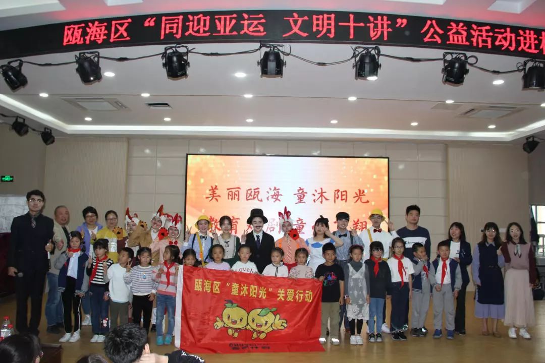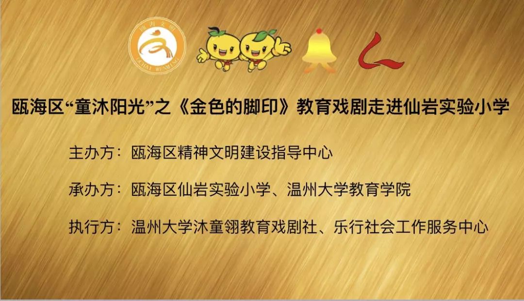 为响应“同迎亚运 文明十讲”,发挥社会组织力量,助力美丽瓯海建设,10月30日下午,由瓯海区精神文明建设指导中心主办的“童沐阳光”关爱行动特邀温州大学沐童翎教育戏剧社,为该校的留守儿童、新居民子女送去别开生面的礼物——《金色的脚印》课本剧表演。