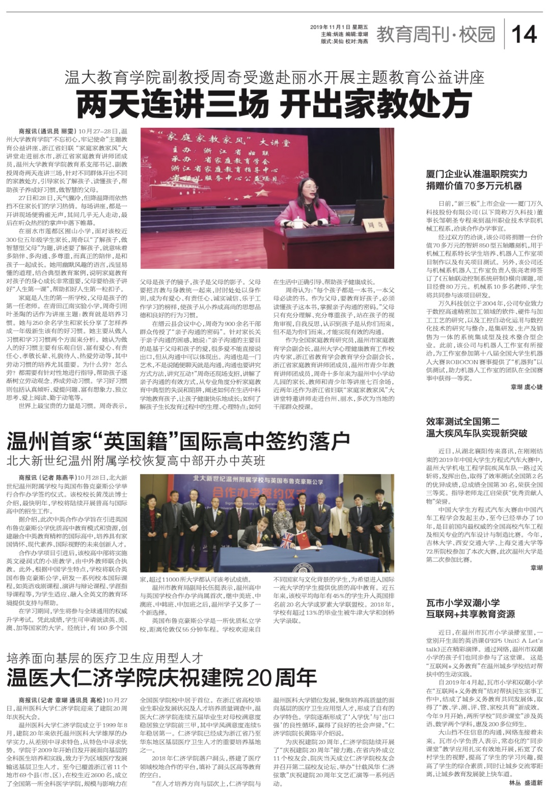 10月27-28日,温州大学教育学院“不忘初心,牢记使命”主题教育公益讲座、浙江省妇联 “家庭家教家风”大讲堂走进丽水市,浙江省家庭教育讲师团成员,温州大学教育学院教育系支部书记、副教授周奇两天连讲三场,针对不同群体开出不同的家教处方,引导家长了解孩子、读懂孩子,帮助孩子养成好习惯,做智慧的父母。