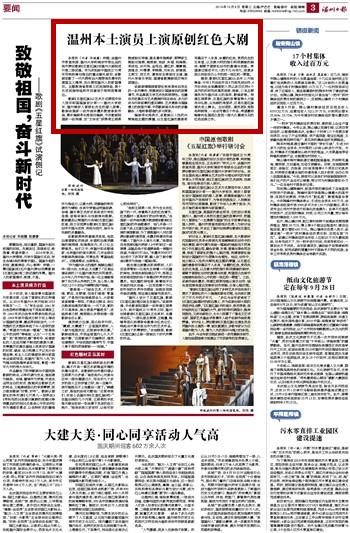本报讯(记者华晓露) 昨晚,由温州市委宣传部、温州大学和瑞安市委出品的我市原创歌剧《五星红旗》在温州大剧院进行第二场试演。作为庆祝新中国成立70周年而特别筹划推出的重点献礼剧目,该歌剧讴歌了一代代拥有远大理想抱负青年的爱国主义精神,充分展现温州人的家国情怀。主题教育省委第三巡回指导组、第十五巡回指导组和市四套班子领导观看演出。