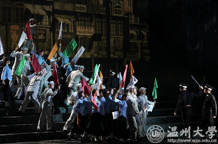 朝霞染色,旭日蓬勃,国旗升起在校园的时刻。先辈来过,英雄走过,涤荡着,希望传薪火……2019年秋天,温州大学操场,开学升国旗仪式后,学生合唱《我的青春中国》。国旗升起的时刻,激情涌动,内心澎湃!今晚,一幕《国旗颂》拉开温州原创四幕歌剧《五星红旗》第二场试演的序幕。温州人的家国情怀,涤荡,不息。