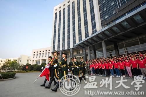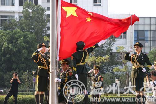 7点,国旗护卫队整队出发,伴随着雄壮的国歌,鲜艳的五星红旗沿着旗杆冉冉升起在温大校园。