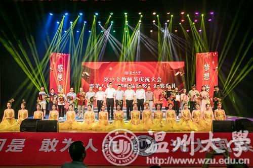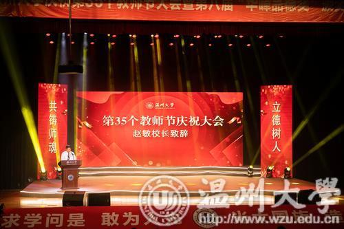 校长赵敏致辞。他说,教师是立教之本、兴校之源。温州大学在办学86年的历程中,始终坚持“立德树人”的教育理念,努力建设一支有理想信念、有道德情操、有扎实学识、有仁爱之心的“四有”教师队伍。在这里,无论是学术造诣深厚的教授名师,还是初入职场的青年教师,他们以德立身、以德立学、以德施教,把真、善、美的种子播撒到每个学生的心田,以高尚的师德师风、高超的教学艺术和高深的学术造诣,生动诠释了人民教师光荣而神圣的职责和使命。