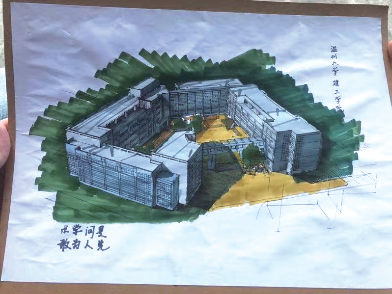 温州大学建工学院的一位新生,因为对专业的热爱,特地绘制了一幅建工大楼手绘图,送给学校。
